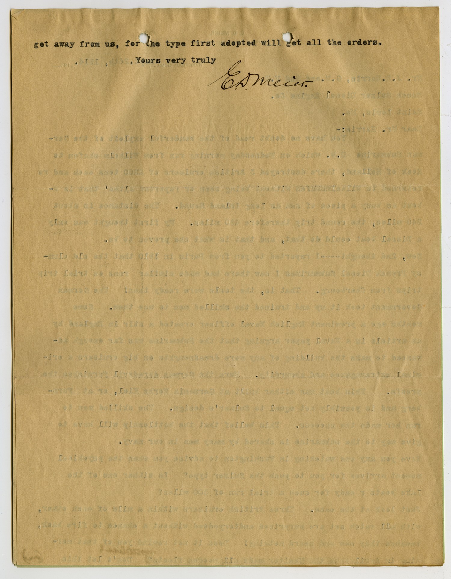 get away from us, for the type first adopted will get all the orders. Yours very truly E.D. Meier.