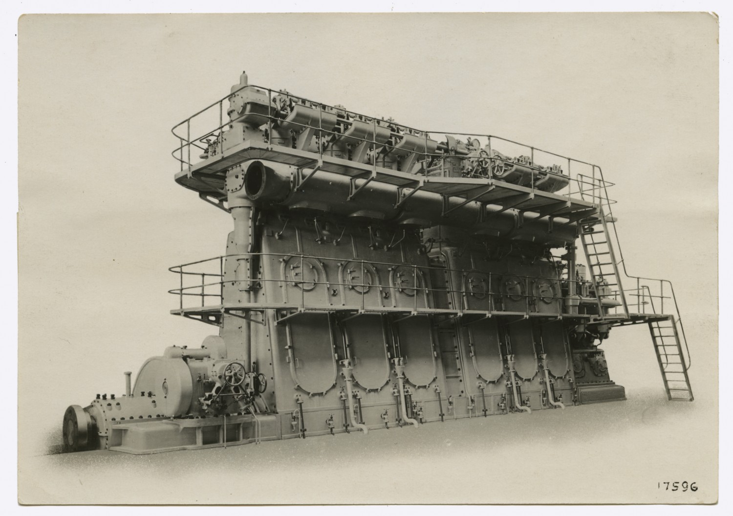 | Description | Photo of submarine engine type 6ST68, 3000 BHP, 100 rev. The 6ST68 engine types were produced by the Busch-Sulzer Brothers Diesel Engine Company for smaller passenger and cargo ships during and after WWI. |