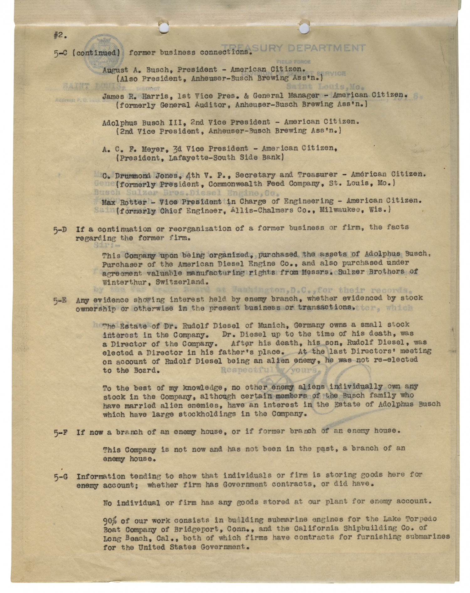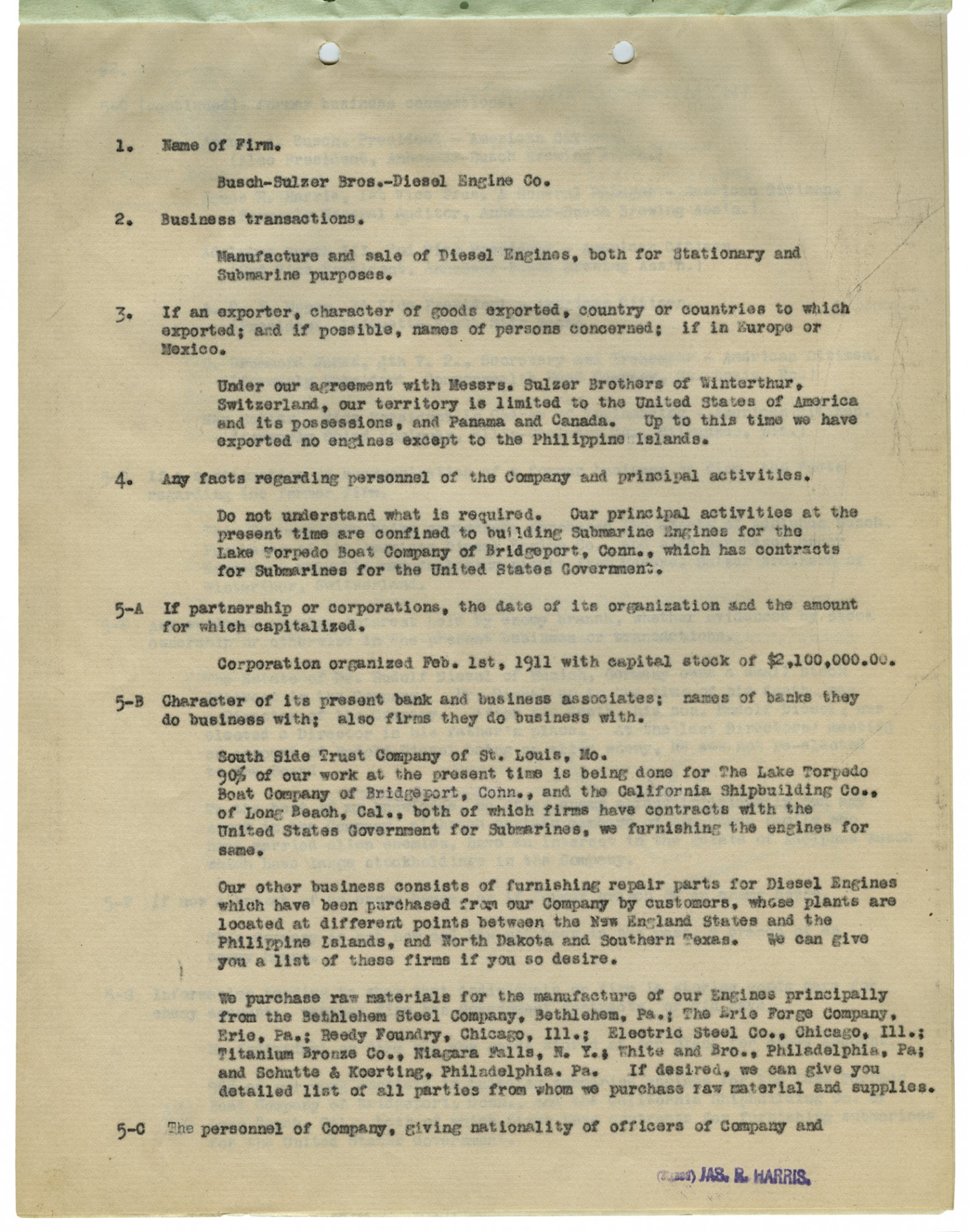 1. Name of Firm. Busch-Sulzer Bros.-Diesel Engine Co. 2. Business transactions. Manufacture and sale of Diesel Engines, both for stationary and Submarine purposes. 3. If an exporter, character of goods exported, country or countries to which exported; and if possible, names of persons concerned; if in Europe or Mexico. Under agreement with Mssrs. Sulzer Brothers of Winterthur, Switzerland, our territory is limited to the United States of America and its possessions, and Panama and Canada. Up to this time we have exported no engines except to the Philippine Islands. 4. Any facts regarding personnel of the Company and principal activities. Do not understand what is required. Our principal activities at the present time are confined to building Submarine Engines for the Lake Torpedo Boat Company of Bridgeport, [Connecticut], which has contracts for Submarines for the United States Government. 5-A If partnership or corporations, the date of its organization and the amount for which capitalized. Corporation organized [February] 1st, 1911 with capital stock of $2,100,000,00. 5-B Character of its present bank and business associates; names of banks they do business with: also firms they do business with. South Side Trust company of St. Louis, [Missouri] 90% of our work at the present time is being done for The Lake Torpedo Boat Company of Bridgeport, [Connecticut], and the California Shipbuilding Co., of Long Beach, [California], both of which firms have contracts with the United States Government for Submarines, we furnishing the engines for same. Our other business consists of furnishing repair parts for Diesel Engines which have been purchased from our Company by customers, whose plants are located at different points between the New England States and the Philippine Islands, and North Dakota and Southern Texas. We can give you a list of these firms if you so desire. We purchase raw materials for the manufacture of our Engines principally from the Bethlehem Steel Company, Bethlehem, [Pennsylvania]; The Erie Forge Company, Erie, [Pennsylvania]; Reedy Foundry, Chicago, [Illinois]; Electric Steel Co., Chicago, [Illinois]; Titanium Bronze Co., Niagara Falls, [New York] White and Bro., Philadelphia, Pa; and Schutte & Koerting, Philadelphia. [Pennsylvania]. If desired, we can give you detailed list of all parties from whom we purchase raw material and supplies. 5-C The personnel of Company, giving nationality of officers of Company and
