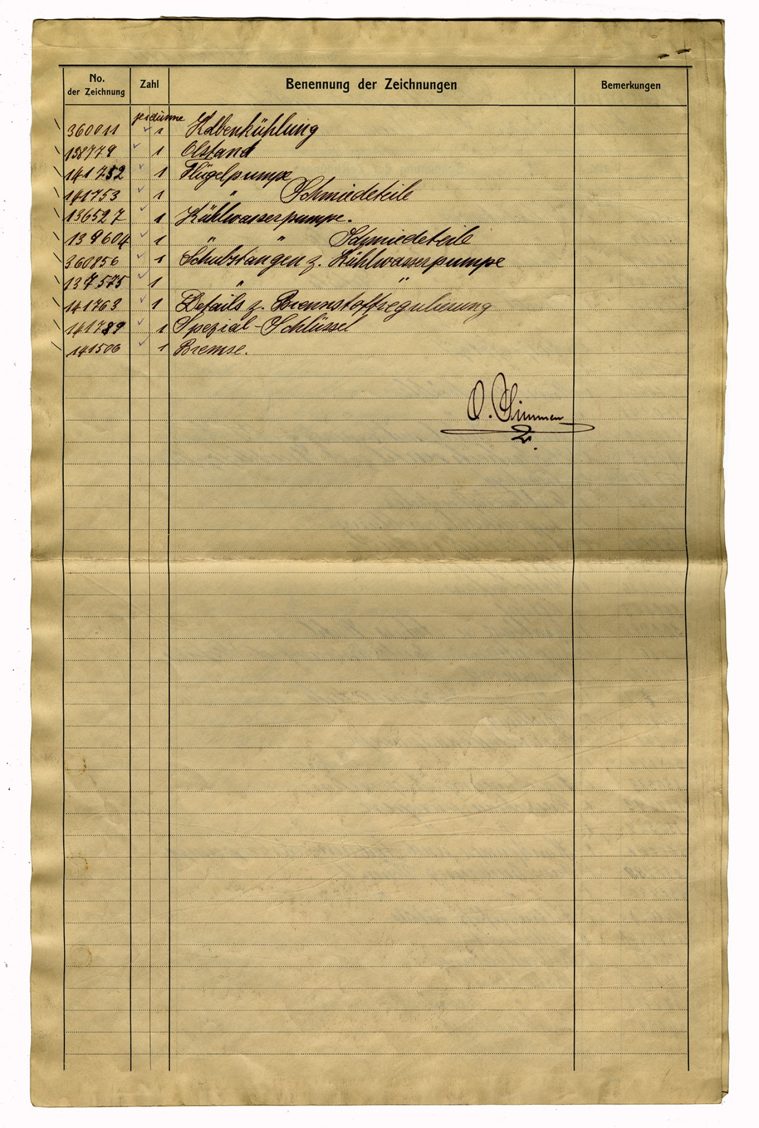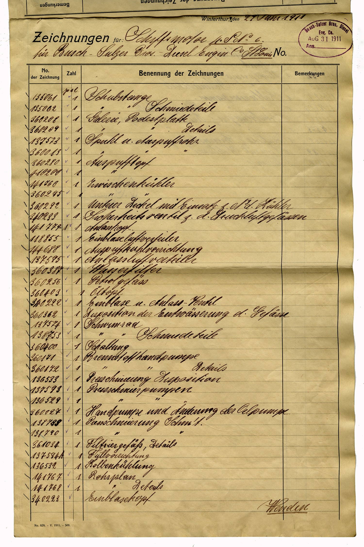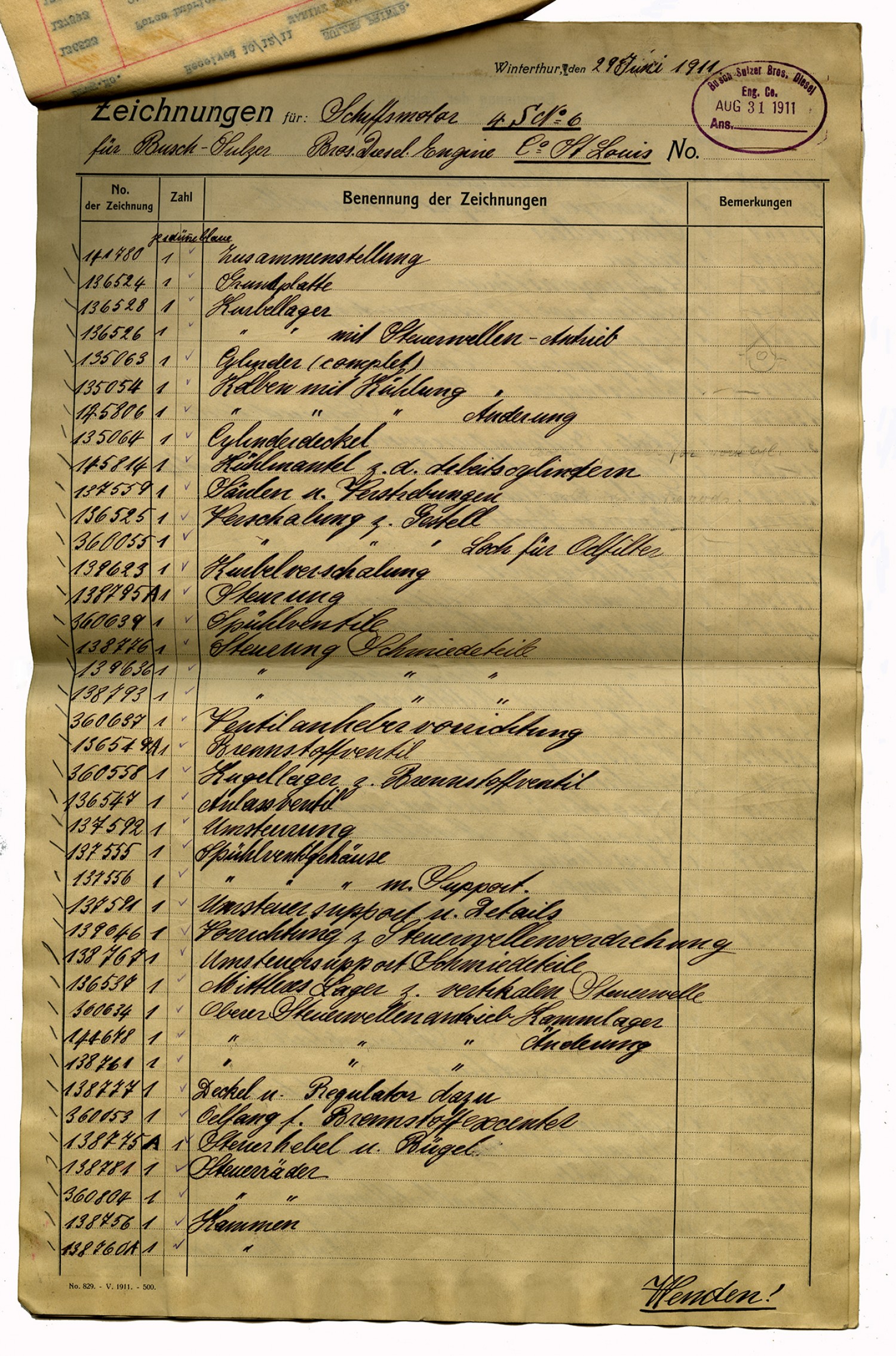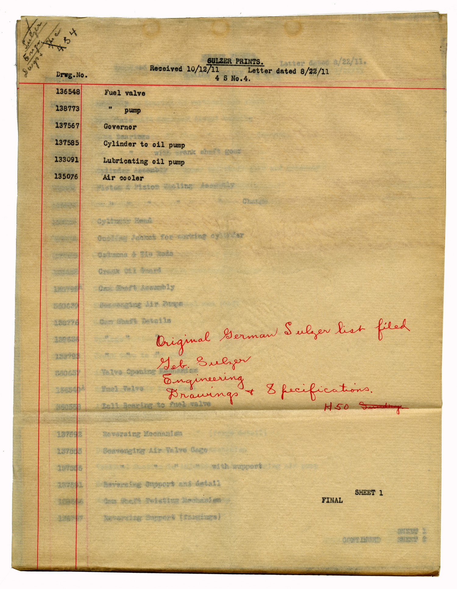 Sulzer 5 [ms illegible: 2 wds] 4S4 SULZER PRINTS. Received 10/12/[1911] Letter dated 8/22/[1911] 4S. No. 4. Drwg. No. 136548 Fuel valve 138773 Fuel pump 137567 Governor 137585 Cylinder to oil pump 133091 Lubricating oil pump 135076 Air cooler Original German Sulzer list filed Geb. Sulzer Engineering Drawings & Specifications H50 SHEET 1 FINAL