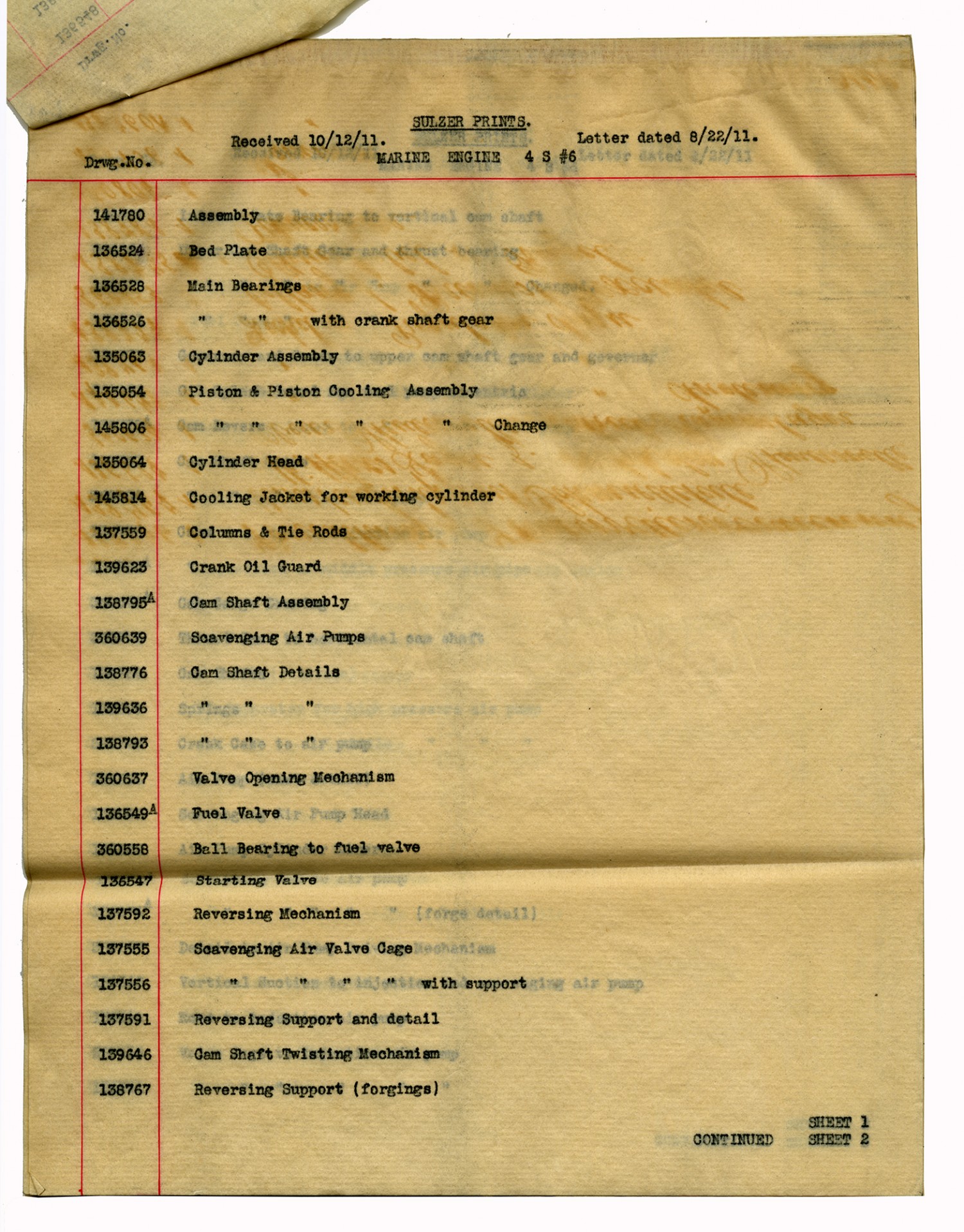 SULZER PRINTS Received 10/12/[1911]. Letter dated 8/22/[1911]. MARINE ENGINE 4 S #6 Drwg. No. 141780 Assembly 136524 Bed plate 136528 Main Bearings 136526 Main Bearing with crank shaft gear 135063 Cylinder Assembly 135054 Piston & Piston Cooling Assembly 145806 Piston & Piston Cooling Assembly Change 135064 Cylinder Head 145814 Cooling Jacket for working cylinder 137559 Columns & Tie Rods 139625 Crank Oil Guard 138795A Cam Shaft Assembly 360639 Scavenging Air Pumps 138776 Cam Shaft Details 139636 Cam Shaft Details 138793 Cam Shaft Details 360637 Valve Opening Mechanism 136549A Fuel Valve 360558 Bell Bearing to fuel valve 136547 Starting Valve 137592 Reversing Mechanism 137555 Scavenging Air Valve Cage 137556 Scavenging Air Valve Cage with support 137591 Reversing Support and detail 139646 Cam Shaft Twisting Mechanism 138767 Reversing Support (forgings) SHEET 1 CONTINUED SHEET 2