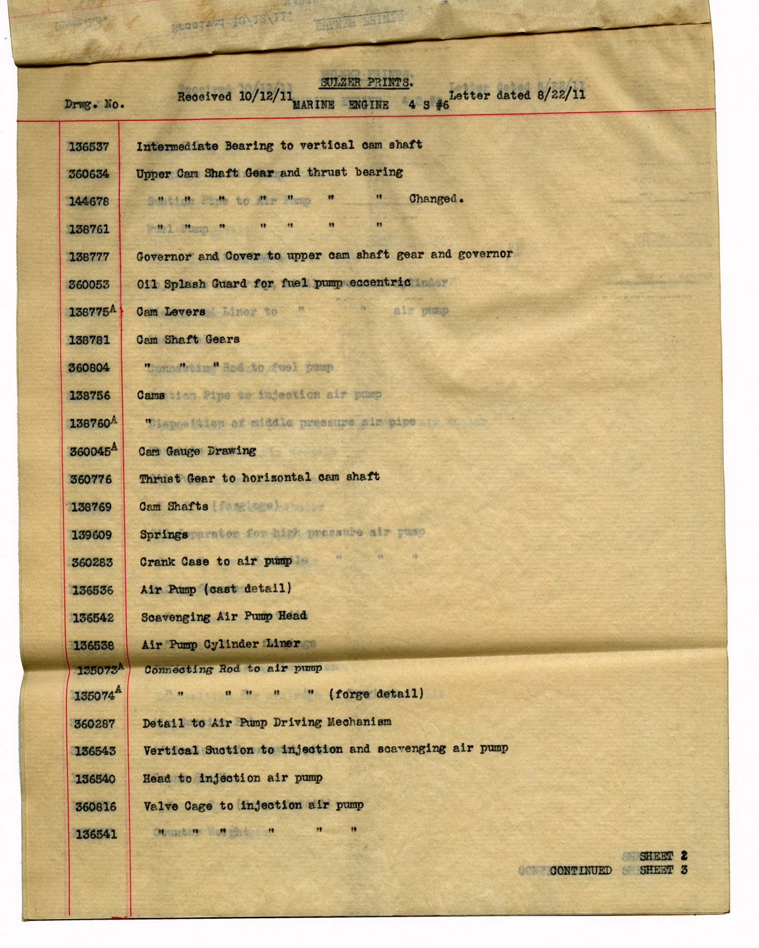 SULZER PRINTS. Received 10/12/[1911] Letter dated 8/22/[1911] MARINE ENGINE 4 S #6 Drwg. No. 136537 Intermediate Bearing to vertical cam shaft 360634 Upper Cam Shaft Gear and thrust bearing 144676 Upper Cam Shaft Gear and thrust bearing Changed. 138761 Upper Cam Shaft Gear and thrust bearing 138777 Governor and Cover to upper cam shaft gear and governor 360053 Oil Splash Guard for fuel pump eccentric 138775A Cam Levers 138781 Cam Shaft Gears 360804 Cam Shaft Gears 138756 Cams 138760A Cams 630045A Cam Gauge Drawing 360776 Thrust Gear to horizontal cam shaft 138769 Cam Shafts 139609 Springs 360283 Crank Case to air pump 136536 Air Pump (cast detail) 136542 Scavenging Air Pump Head 136538 Air Pump Cylinder Liner 135073A Connecting Rod to air pump 135074A Connecting Rod to air pump (forge detail) 360287 Detail to Air Pump Driving Mechanism 136543 Vertical Suction to injection and scavenging air pump 136540 Head to Injection air pump 360816 Valve Cage to injection air pump 136541 Valve Cage to injection air pump SHEET 2 CONTINUED SHEET 3