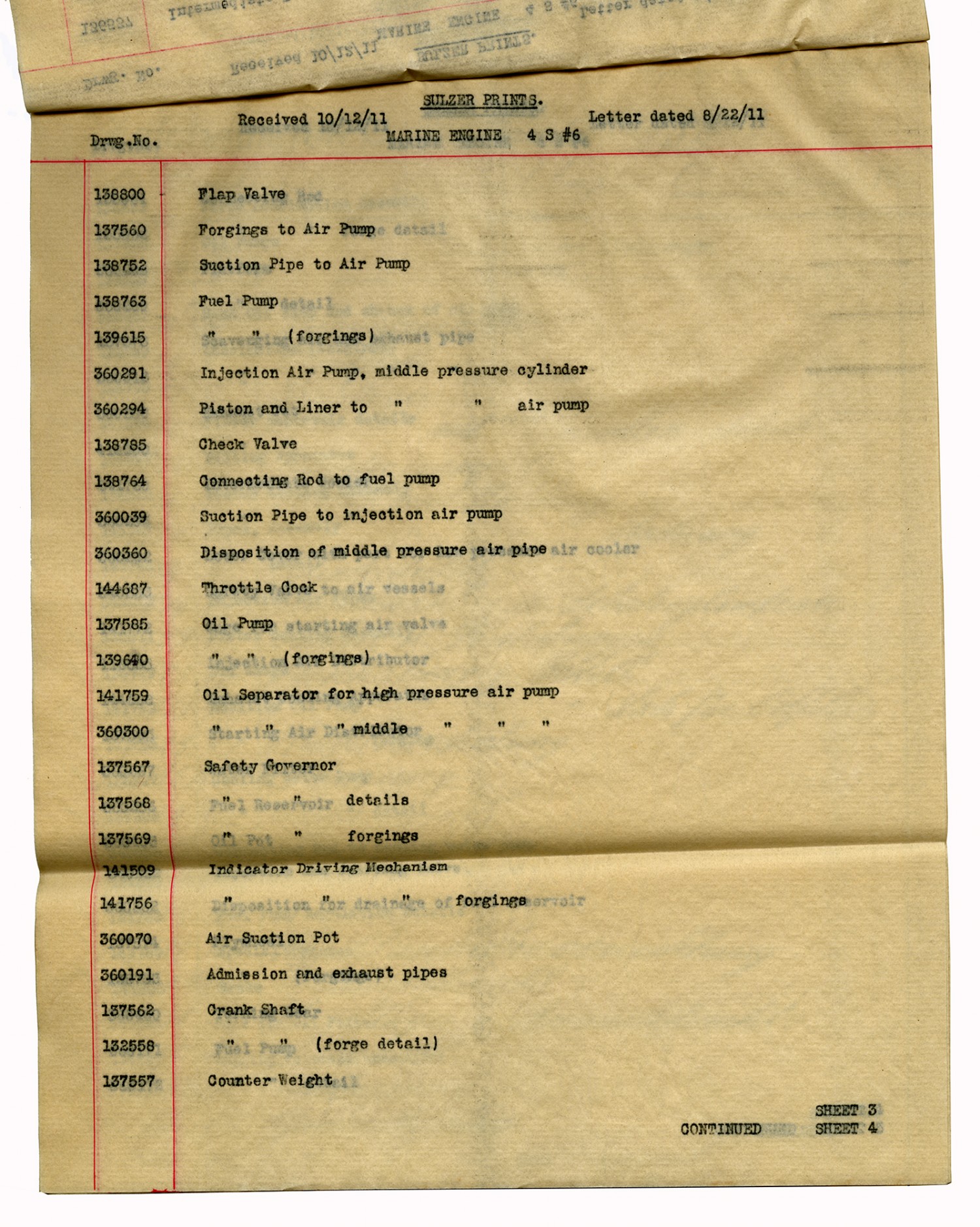 SULZER PRINTS. Received 10/12/[1911] Letter dated 8/22/[1911] MARINE ENGINE 4 S #6 Drwg. No. 138800 Flap Valve 137560 Forging to Air Pump 138752 Suction Pipe to Air Pump 138763 Fuel Pump 139615 Fuel Pump (forgings) 360291 Injection Air Pump, middle pressure cylinder 360294 Piston and Liner to middle pressure air pump 138785 Check Valve 138764 Connecting Rod to fuel pump 360039 Suction Pipe to injection air pump 360360 Disposition of middle pressure air pipe 144687 Throttle Cock 137585 Oil Pump 139564 Oil pump (forgings) 141759 Oil Separator for high pressure air pump 360300 Oil Separator for middle pressure air pump 137567 Safety Governor 137568 Safety Governor details 137569 Safety Governor forgings 141509 Indicator Driving Mechanism 141756 Indicator Driving Mechanism forgings 360070 Air Suction Pot 360191 Admission and exhaust pipes 137562 Crank Shaft 132558 Crank Shaft (forge detail) 137557 Counter Weight SHEET 3 CONTINUED SHEET 4