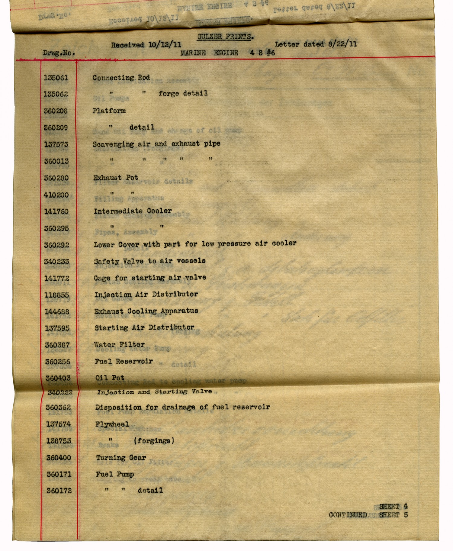 SULZER PRINTS. Received 10/12/[1911] Letter dated 8/22/[1911] MARINE ENGINE 4 S #6 Drwg. No. 135061 Connecting Rod 135062 Connecting Rod forge detail 360208 Platform 360209 Platform detail 137573 Scavenging air and exhaust pipe 360013 Scavenging air and exhaust pipe 360280 Exhaust Pot 410200 Exhaust Pot 141760 Intermediate Cooler 360295 Intermediate Cooloer 360292 Lower Cover with part for low pressure air cooler 340233 Safety Valve to air vessels 141772 Cage for starting air valve 118855 Injection Air Distributor 144688 Exhaust Cooling Apparatus 137595 Starting Air Distributor 360387 Water Filter 360256 Fuel Reservoir 360403 Oil Pot 340222 Injection and Starting Valve 360362 Disposition for drainage of fuel reservoir 137574 Flywheel 138753 Flywheel (forgings) 360400 Turning Gear 360171 Fuel Pump 360172 Fuel Pump detail SHEET 4 CONTINUED SHEET 5