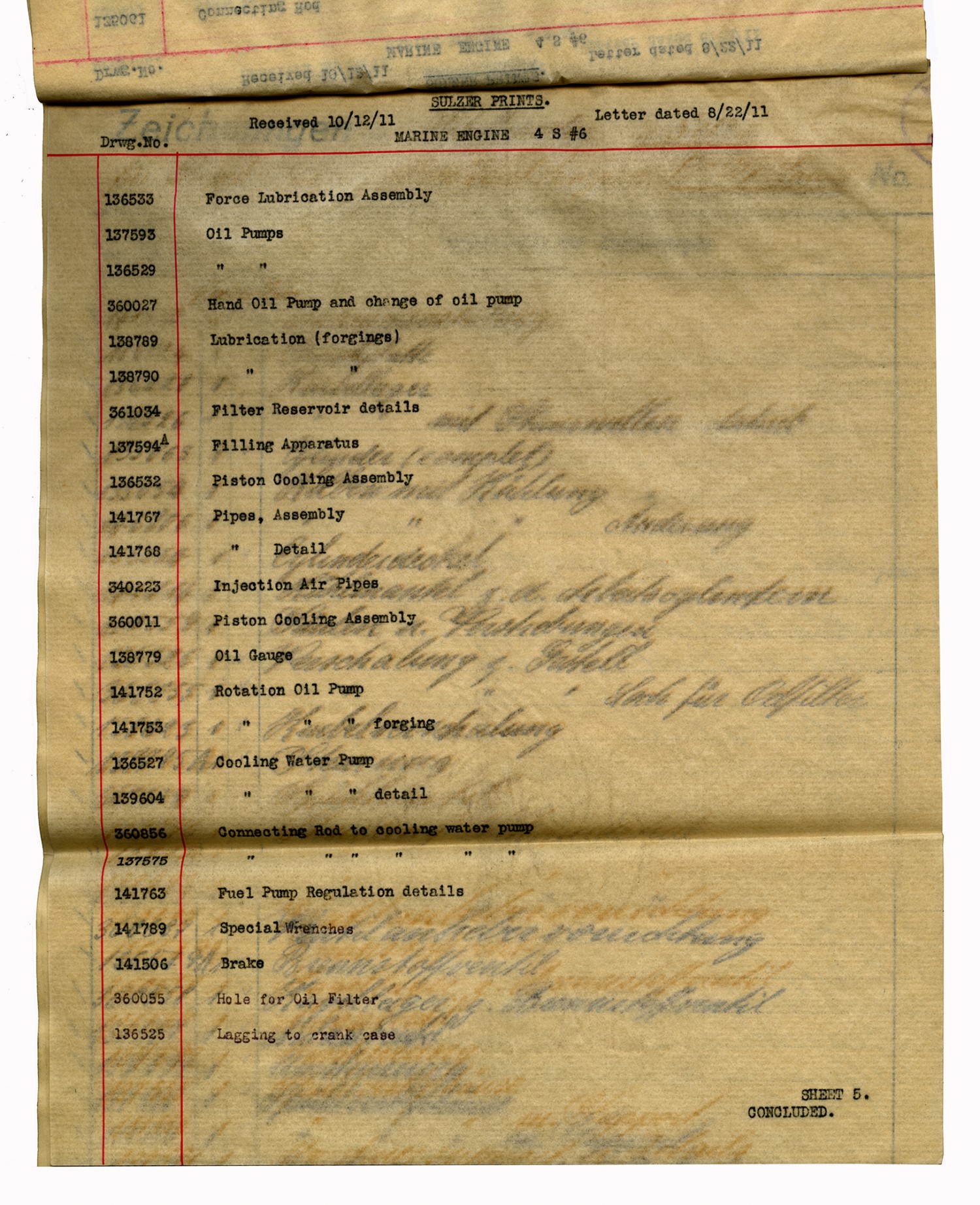 SULZER PRINTS. Received 10/12/[1911] Letter dated 8/22/[1911] MARINE ENGINE 4 S #6 Drwg. No. 136533 Force Lubrication Assembly 137593 Oil Pumps 136529 Oil Pumps 360027 Hand Oil Pump and change of oil pump 138789 Lubrication (forgings) 138790 Lubrication (forgings) 361034 Filter Reservoir details 137594A Filling Apparatus 136532 Piston Cooling Assembly 141767 Pipes, Assembly 141768 Pipes Detail 340223 Injection Air Pipes 360011 Piston Cooling Assembly 138779 Oil Gauge 141752 Rotation Oil Pump 141753 Rotation Oil Pump forging 136527 Cooling Water Pump 139604 Cooling Water Pump detail 360856 Connecting Rod to cooling water pump 137575 Connecting Rod to cooling water pump 141763 Fuel Pump Regulation details 141789 Special Wrenches 141506 Brake 360055 Hole for Oil Filter 136525 Lagging to crank case SHEET 5. CONCLUDED.