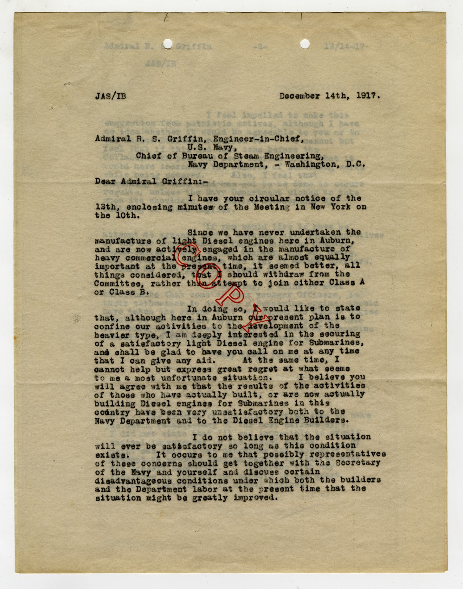 JAS/IB December 14th, 1917. Admiral R.S. Griffin, Engineer-in-Chief, U.S. Navy, Chief of Bureau of Steam Engineering, Navy Department, -Washington, D.C. Dear Admiral Griffin:- I have your circular notice of the 12th, enclosing minutes of the Meeting in New York on the 10th. Since we have never undertaken the manufacture of light Diesel engines here in Auburn, and are now actively engaged in the manufacture of heavy commercial engines, which are almost equally important at the present time, it seemed better, all things considered, that I should withdraw from the Committee, rather than attempt to join either Class A or Class B. In doing so, I would like to state that, although here in Auburn our present plan is to confine our activities to the development of the heavier type, I am deeply interested in the securing of a satisfactory light Diesel engine for Submarines, and shall be glad to have you call on me at any time that I can give any aid. At the same time, I cannot help but express great regret at what seems to me a most unfortunate situation. I believe you will agree with me that the results of the activities of those who have actually built, or are now actually building Diesel engines for Submarines in this country have been very unsatisfactory both to the Navy Department and to the Diesel Engine Builders. I do not believe that the situation will ever be satisfactory so long as this condition exists. It occurs to me that possibly representatives of these concerns should get together with the Secretary of the Navy and yourself and discuss certain disadvantageous conditions under which both the builders and the Department labor at the present time that the situation might be greatly improved.
