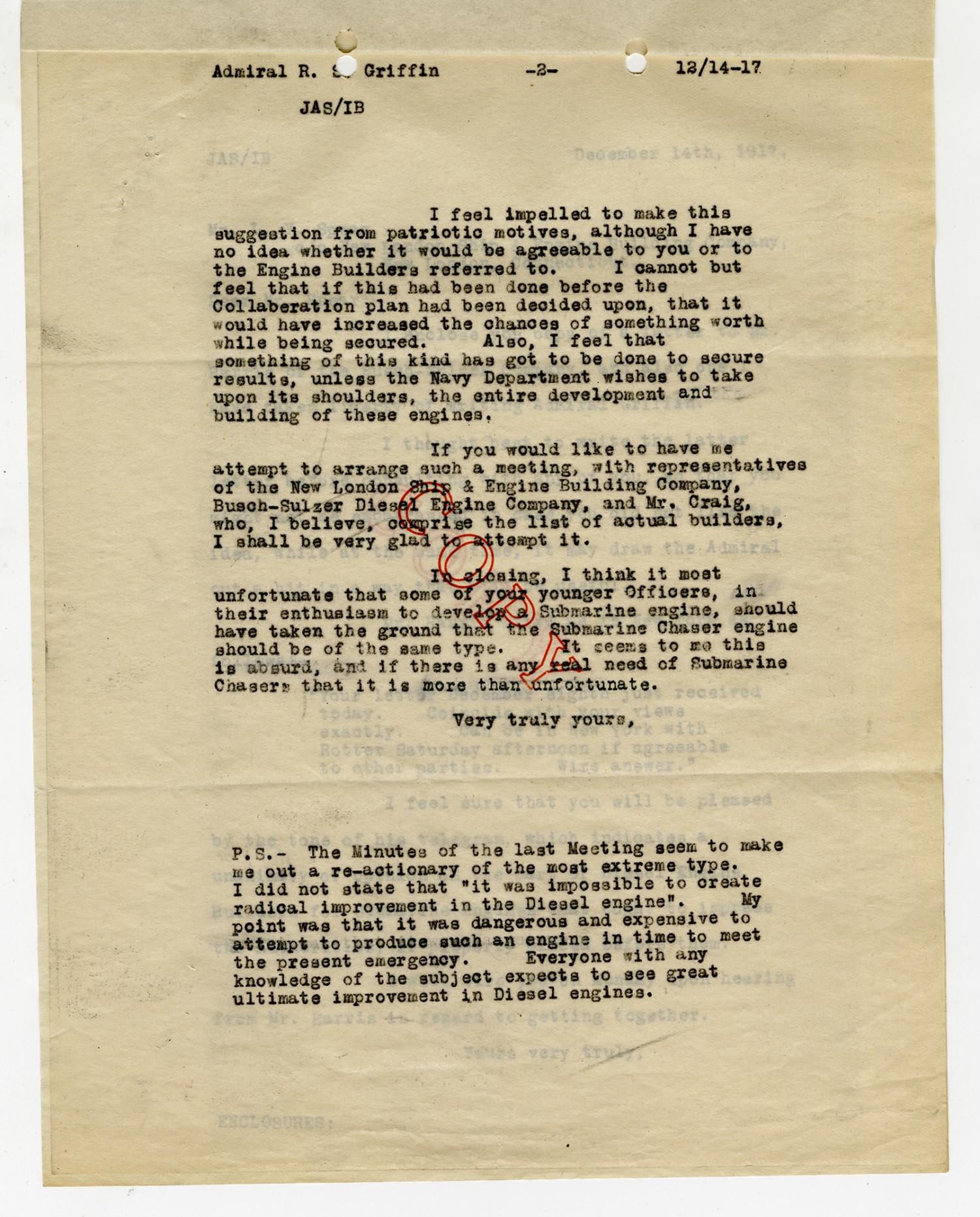 Admiral R.S. Griffin [page 2] 12/14-[1917] JAS/IB I feel impelled to make this suggestion from patriotic motives, although I have no idea whether it would be agreeable to you or to the Engine Builders referred to. I cannot but feel that if this had been done before the Collaberation plan had been decided upon, that it would have increased the chances of something worth while being secured. Also, I feel that something of this kind has to be done to secure results, unless the Navy Department wishes to take upon its shoulders, the entire development and building of these engines. If you would like to have me attempt to arrange such a meeting, with representatives of the New London Ship & Engine Building Company, Busch-Sulzer Diesel Engine Company, and Mr. Craig, who, I believe, comprise the list of actual builders, I shall be very glad to attempt it. In closing, I think it most unfortunate that some of your younger Officers, in their enthusiasm to develop a Submarine engine, should have taken the ground that the Submarine Chaser engine should be of the same type. It seems to me this is absurd, and if there is any real need of Submarine Chasers that it is more than unfortunate. Very truly yours, P.S.- The Minutes of the last Meeting seem to make me out a re-actionary of the most extreme type. I did not state that