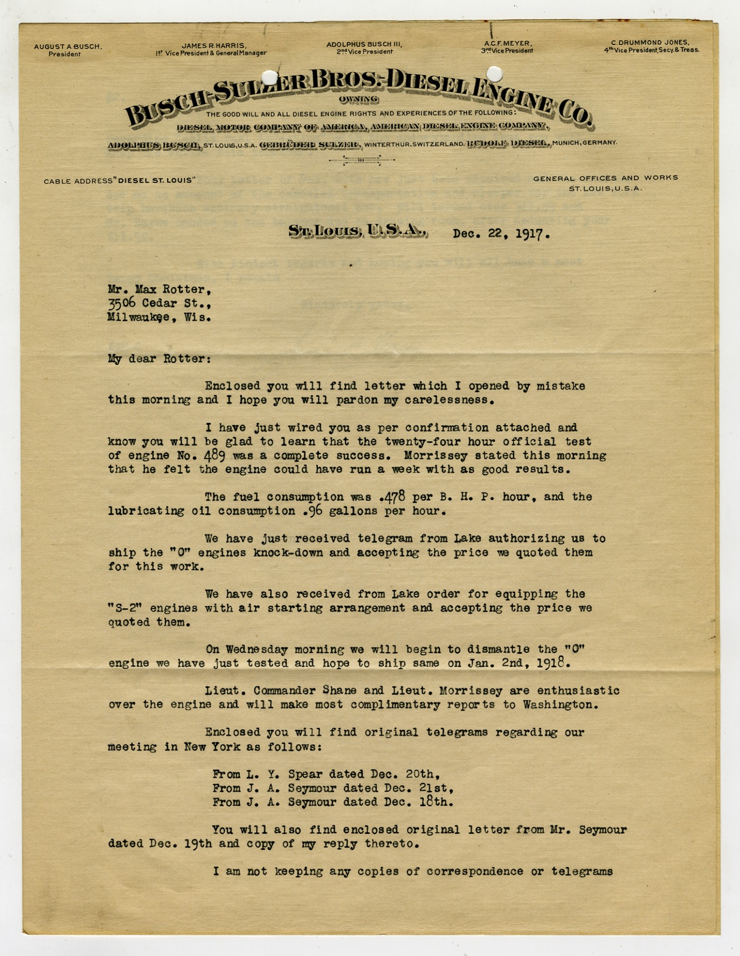 [Busch-Sulzer Diesel Engine Company letterhead] St. Louis, U.S.A. [December] 22, 1917. Mr. Max Rotter, 3506 Cedar St., Milwaukee, [Wisconsin] My dear Rotter: Enclosed you will find letter which I opened by mistake this morning and I hope you will pardon my carelessness. I have just wire you as per confirmation attached and know you will be glad to learn that the twenty-four hour official test of engine No. 489 was a complete success. Morrissey stated this morning that he felt the engine could have run a week with as good results. The fuel consumption was .478 per B.H.P. hour, and the lubricating oil consumption .96 gallons per hour. We have just received telegram from Lake authorizing us to ship the "O" engines knock-down and accepting the price we quoted them for this work. We have also received from Lake order for equipping the "S-2" engines with air starting arrangement and accepting the price we quoted them. On Wednesday morning we will begin to dismantle the "O" engine we have just tested and hope to ship same on [January] 2nd, 1918. Lieut. Commander Shane and Lieut. Morrissey are enthusiastic over the engine and will make most complimentary reports to Washington. Enclosed you will find original telegrams regarding our meeting in New York as follows: From L.Y. Spear dated [December] 20th, From J.A. Seymour dated [December] 21st, From J.A. Seymour dated [December] 18th. You will also find enclosed original letter from Mr. Seymour dated [December] 19th and copy of my reply thereto. I am not keeping any copies of correspondence or telegrams
