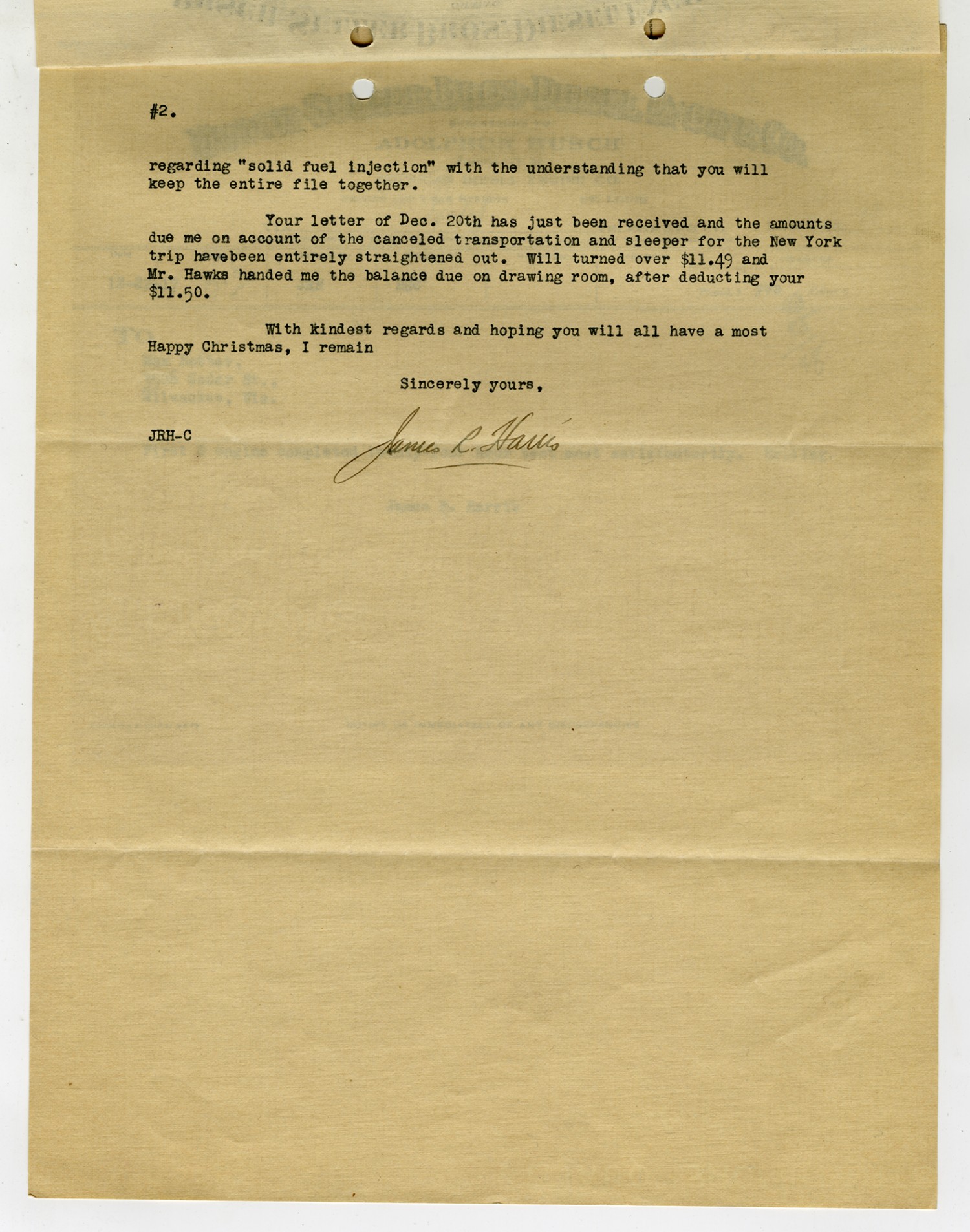 [page 2] regarding "solid fuel injection" with the understanding that you will keep the entire file together. Your letter of the [December] 20th had just been received and the amounts due me on account of the canceled transportation and sleeper for the New York trip have been entirely straightened out. Will turned over $11.49 and Mr. Hawks handed me the balance due on drawing room, after deducting your $11.50. With kindest regards and hoping you will all have a most Happy Christmas, I remain Sincerely yours, James R. Harris JRH-C