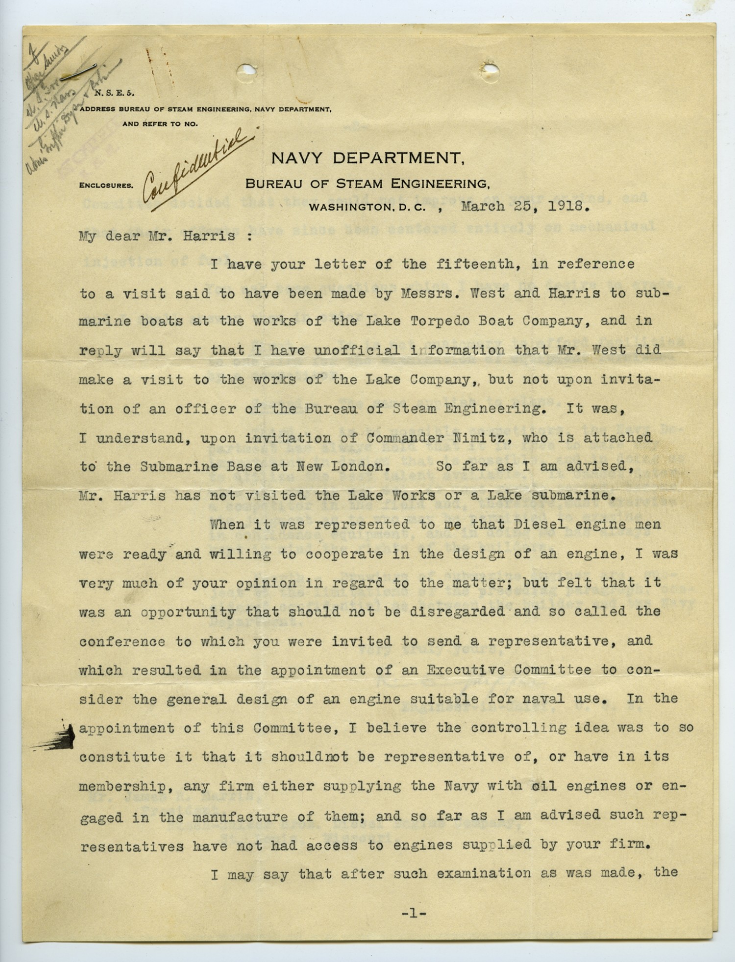 [Navy Department letterhead] BUREAU OF STEAM ENGINEERING WASHINGTON, D.C., March 25, 1918. My dear Mr. Harris: I have your letter of the fifteenth, in reference to a visit said to have been made by Messrs. West and Harris to submarine boats at the works of the Lake Torpedo Boat Company, and in reply will say that I have unofficial information that Mr. West did make a visit to the works of the Lake Company, but not upon invitation of an officer of the Bureau of Steam Engineering. It was, I understand, upon invitation of Commander Nimitz, who is attached to the Submarine Base at New London. So far as I am advised, Mr. Harris has not visited the Lake Works or a Lake submarine. When it was represented to me that Diesel engine men were ready and willing to cooperate in the design of an engine, I was very much of your opinion in regard to the matter; but felt that it was an opportunity that should not be disregarded and so called the conference to which you were invited to send a representative, and which resulted in the appointment of an Executive Committee to consider the general design of an engine suitable for naval use. In the appointment of this Committee, I believe the controlling idea was to so constitute it that it should not be representative of, or have in its membership, any firm either supplying the Navy with oil engines or engaged in the manufacture of them; and so far as I am advised such representatives have not had access to engines supplied by your firm. I may say that after such examination as was made, the [page one]