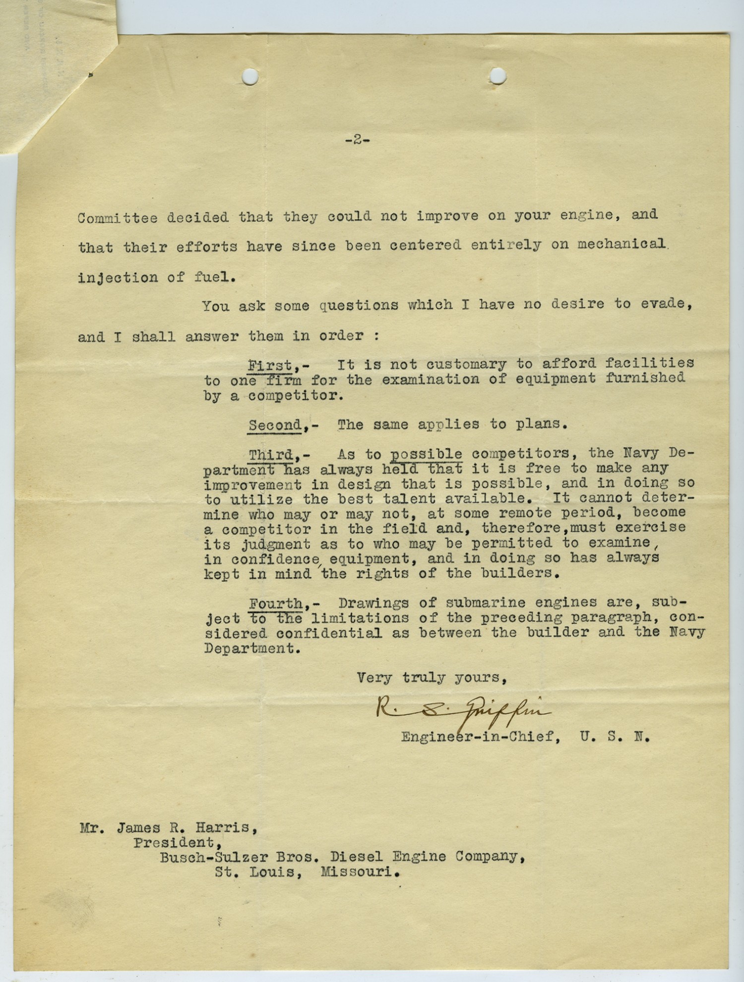 [page 2] Committee decided that they could not improve on your engine, and that their efforts have since been centered entirely on mechanical injection of fuel. You ask some questions which I have no desire to evade, and I shall answer them in order : First,- It is not customary to afford facilities to one firm for the examination of equipment furnished by a competitor. Second,- The same applies to plans. Third,- As to possible competitors, the Navy Department has always held that it is free to make any improvement in design that is possible, and in doing so to utilize the best talent available. It cannot determine who may or may not, at some remote period, become a competitor in the field and, therefore, must exercise its judgement as to who may be permitted to examine in confidence equipment, and in doing so has always kept in mind the rights of the builders. Fourth,- Drawings of submarine engines are, subject to the limitations of the preceding paragraph, considered confidential as between the builder and the Navy Department. Very truly yours, [Robert S. Griffin] Engineer-in-Chief, U.S.N. Mr. James R. Harris, President, Busch-Sulzer Bros. Diesel Engine company, St. Louis, Missouri.