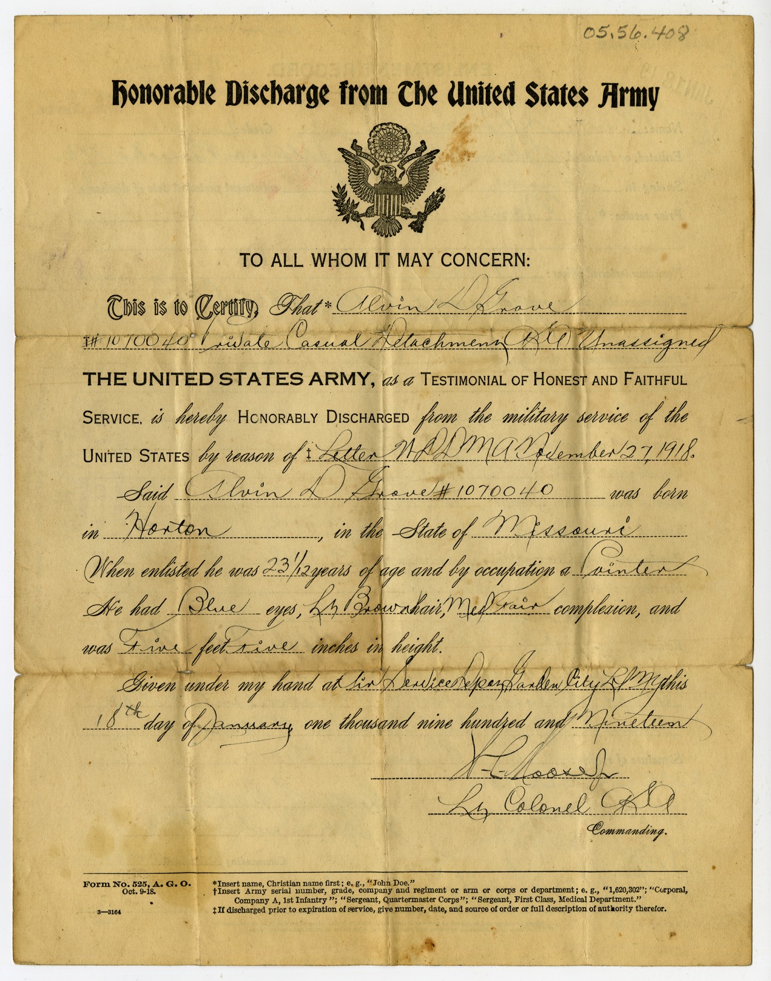 Honorable Discharge from The United States Army TO ALL WHOM IT MAY CONCERN: This is to Certify That Alvin D Grove 1070040 Private Casual Detachment [ms illegible: 1 wd] Unassigned THE UNITED STATES ARMY, as a TESTIMONIAL OF HONEST AND FAITHFUL SERVICE, is hereby HONORABLY DISCHARGED from the military service of the UNITED STATES by reason of Letter WDDMA November 27, 1918. Said Alvin D. Grove # 1070040 was born in Horton, in the State of Missouri When enlisted he was 23 1/2 years of age and by occupation a Painter He had Blue eyes, Lt Brown hair, Med Fair complexion, and was Five feet Five inches in height. Given under my hand at Am Service Dept, Garden City Lt Mythis 18th Day of January one thousand nine hundred and nineteen [ms illegible: signature] Lt Colonel USA Commanding