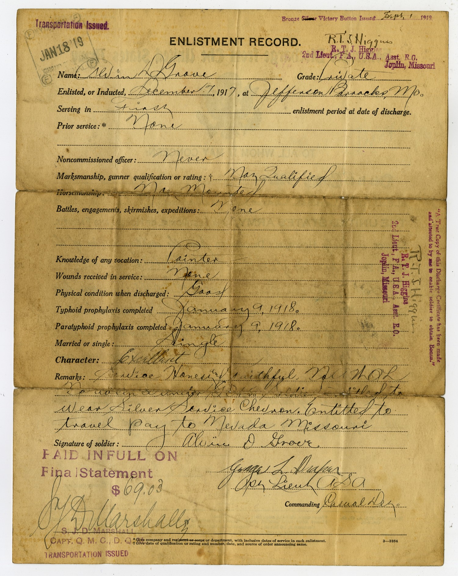 ENLISTMENT RECORD. Name: Alvin D. Grove Grade: Private Enlisted, or Inducted, December 7, 1917, at Jefferson Barracks, [Missouri] Serving in First enlistment period at date of discharge. Prior service: None Noncommissioned officer: Never Marksmanship, gunner qualification or rating: Non Qualified Horsemanship. Non Mounted Battles, engagements, skirmishes, expeditions: None Knowledge of any vocation: Painter Wounds received in service: None Physical condition when discharge: Good Typhoid prophylaxis completed January 9, 1918. Paratyphoid prophylaxis completed January 9, 1918. Married or single: Single Character: Excellent Remarks: Service Honest and Faithful. No AWOL No absence under GO 450 Soldier entitled to wear Silver Service Chevron. Entitled to travel pay to Nevada Missouri Signature of soldier: Alvin D. Grove. George L. Draper 1st Lieut ASA Commanding Casual Det. [stamp] PAID IN FULL ON Final Statement $69.03 S.J. D. Marshall CAPT. Q.M.C., D.Q.M. TRANSPORTATION ISSUED