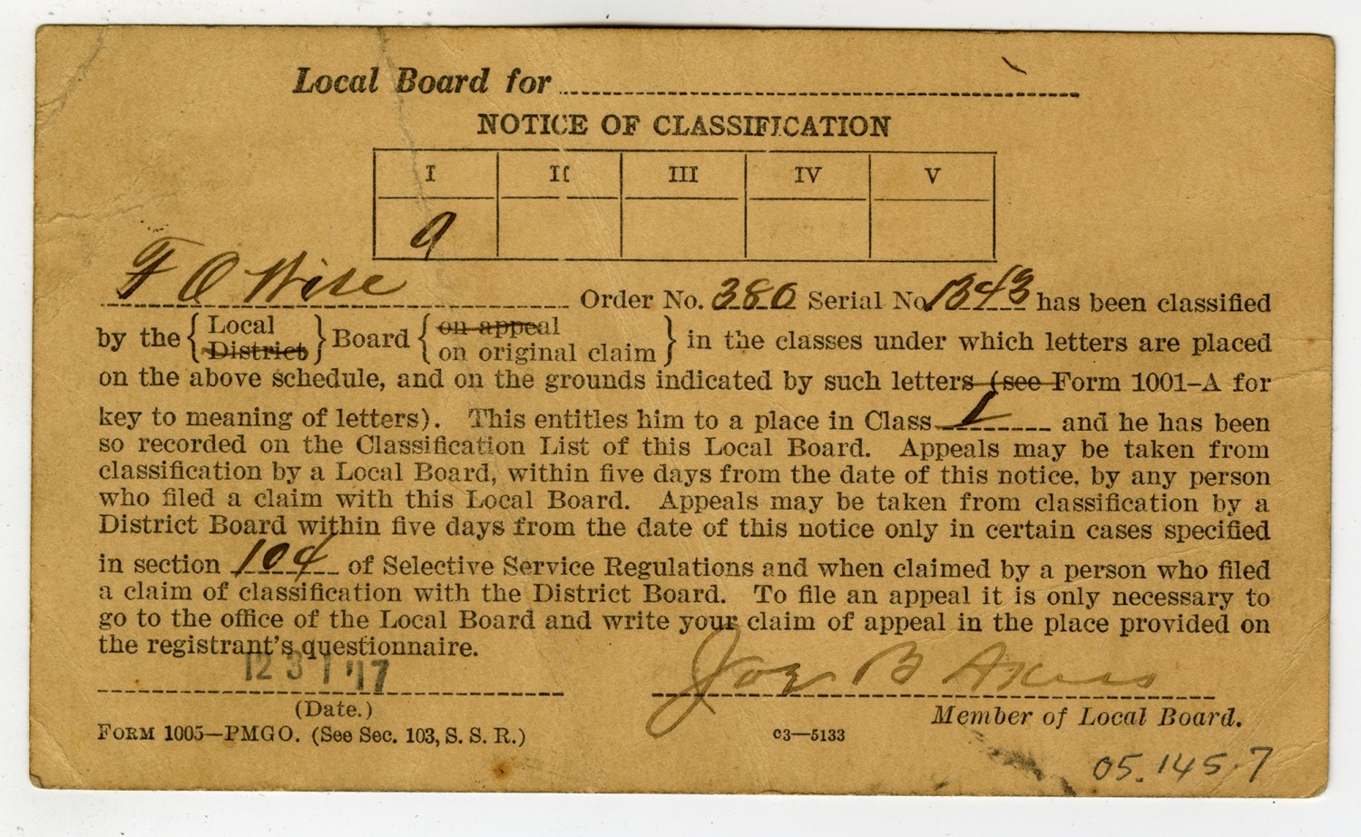 Local Board for NOTICE OF CLASSIFICATION I A F O Wise Order No. 380 Serial No 1343 has been classified by the {Local} Board {on original claim} in the classes under which letters are placed on the above schedule, and on the grounds indicated by such letters (see Form 1001-A for key to meaning of letters). This entitles him to a place in Class I and he has been so recorded on the Classification List of this Local Board. Appeals may be taken from classification by a Local Board, within five days from the date of this notice, by any person who filed a claim with this Local Board. Appeals may be taken from classification by a District Board within five days from the date of this notice only in certain cases specified in section 104 of Selective Service Regulations and when claimed by a person who filed a claim of classification with the District Board. To file an appeal it is only necessary to go to the office of the Local Board and write your claim of appeal I the place provided on the registrant