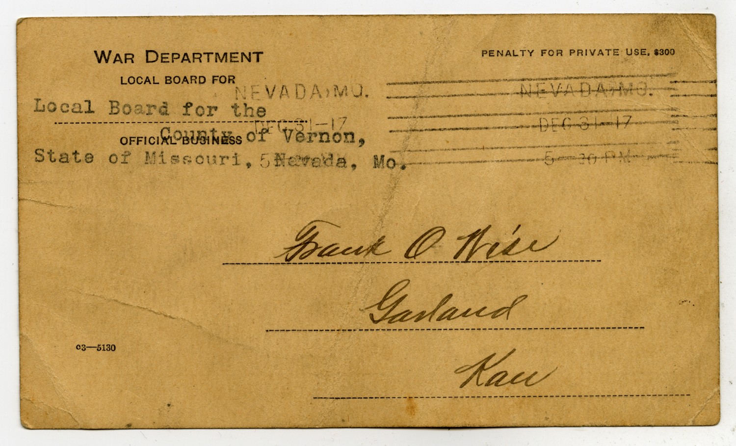 WAR DEPARTMENT LOCAL BOARD FOR OFFICIAL BUSINESS [stamp] Nevada, [Missouri] Local Board for the County of Vernon, State of Missouri, Nevada, [Missouri] Penalty for private use, $300 Nevada, [Missouri December] 31-[1917] 5-30 PM Frank O Wise Garland [Kansas]