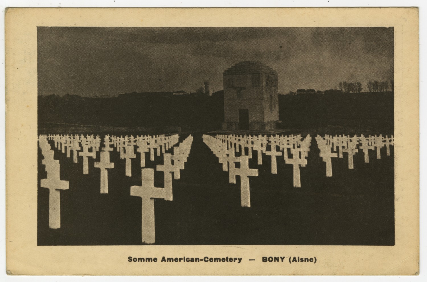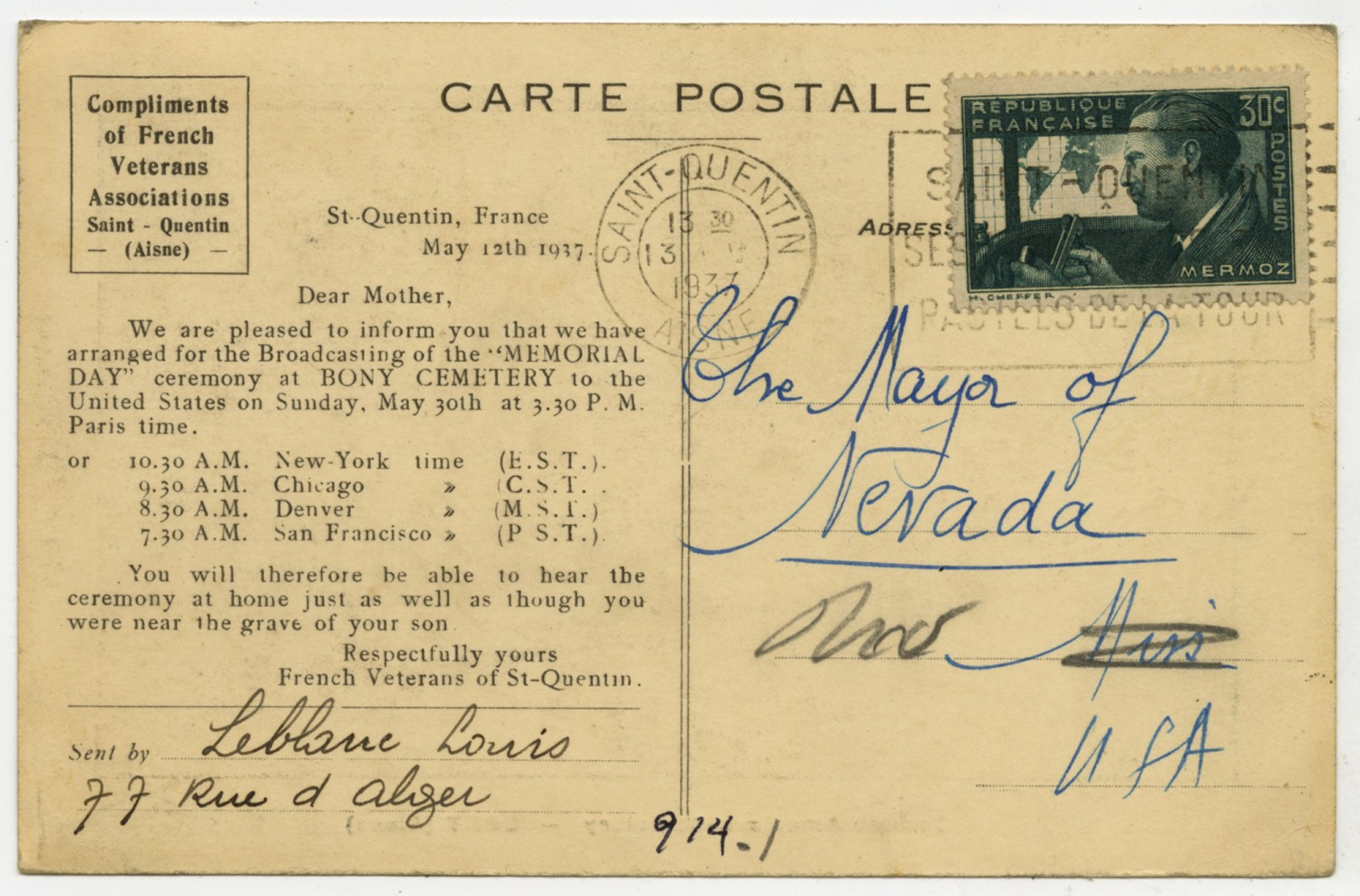 | Description | Postcard of the American Cemetery in Somme from Leblanc Louis to the Mayor of Nevada. The postcard listed the date and times of a Memorial Day ceremony that was broadcast on May 3, 1937 from the Bony Cemetery in France. |