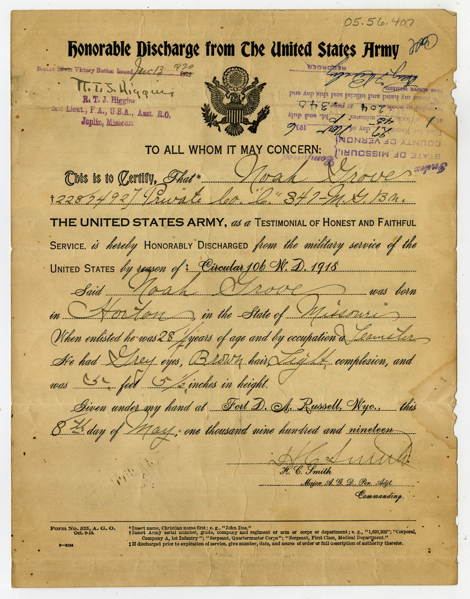 | Source | Grove, Noah, Discharge Certificate and Enlistment Record. 08 May 1919. Bushwhacker Museum World War I Collection. 05.56.407.Bushwhacker Museum, Nevada, Missouri. |