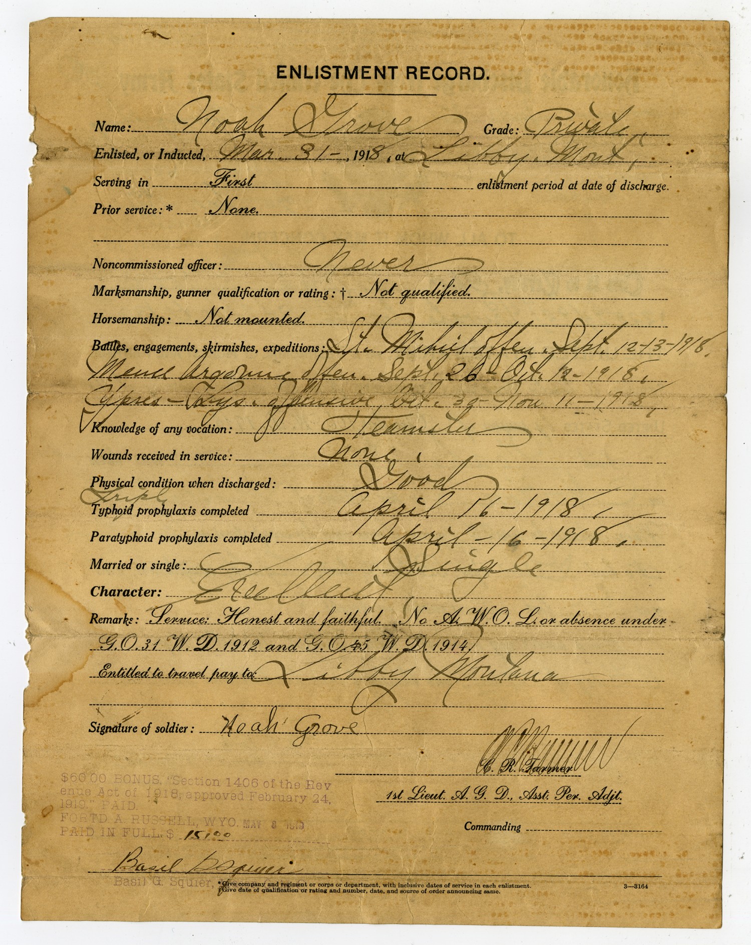 ENLISTMENT RECORD. Name: Noah Grove Grade: Private Enlisted, or Inducted, [March] 31- 1918, at Libby, [Montana]. Serving in Frist enlistment period at date of discharge. Prior service: None. Noncommissioned officer: Never Marksmanship, gunner qualification or rating: Not qualified. Horsemanship: Not mounted. Battles, engagements, skirmishes, expeditions: St. Mihiel offen. [September] 12-13-1918. Meuse Argonne offen. [September] 26 - [October] 12-1918. Ypres-Lys. Offensive [October] 30 - [November] 11-1918. Knowledge of any vocation: Teamster Wounds received in service: None. Physical condition when discharged: Good Typhoid prophylaxis completed April 16-1918 Paratyphoid prophylaxis completed April 16-1918 Married or single: Single Character: Excellent Remarks: Service: Honest and faithful. No A.W.O.L. or absence under G.O. 31 W.D. 1912 and G.O. 45 W.D. 1914. Entitled to travel pay to Libby Montana Signature of soldier: Noah Grove C.R. Farmer 1st Lieut. A.G.D., Asst., Per. Adjt. Commanding [stamp] $60 00 BONUS