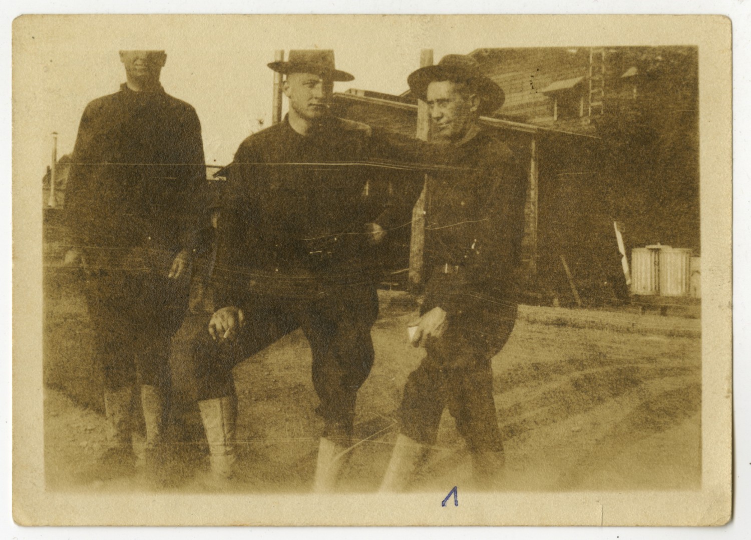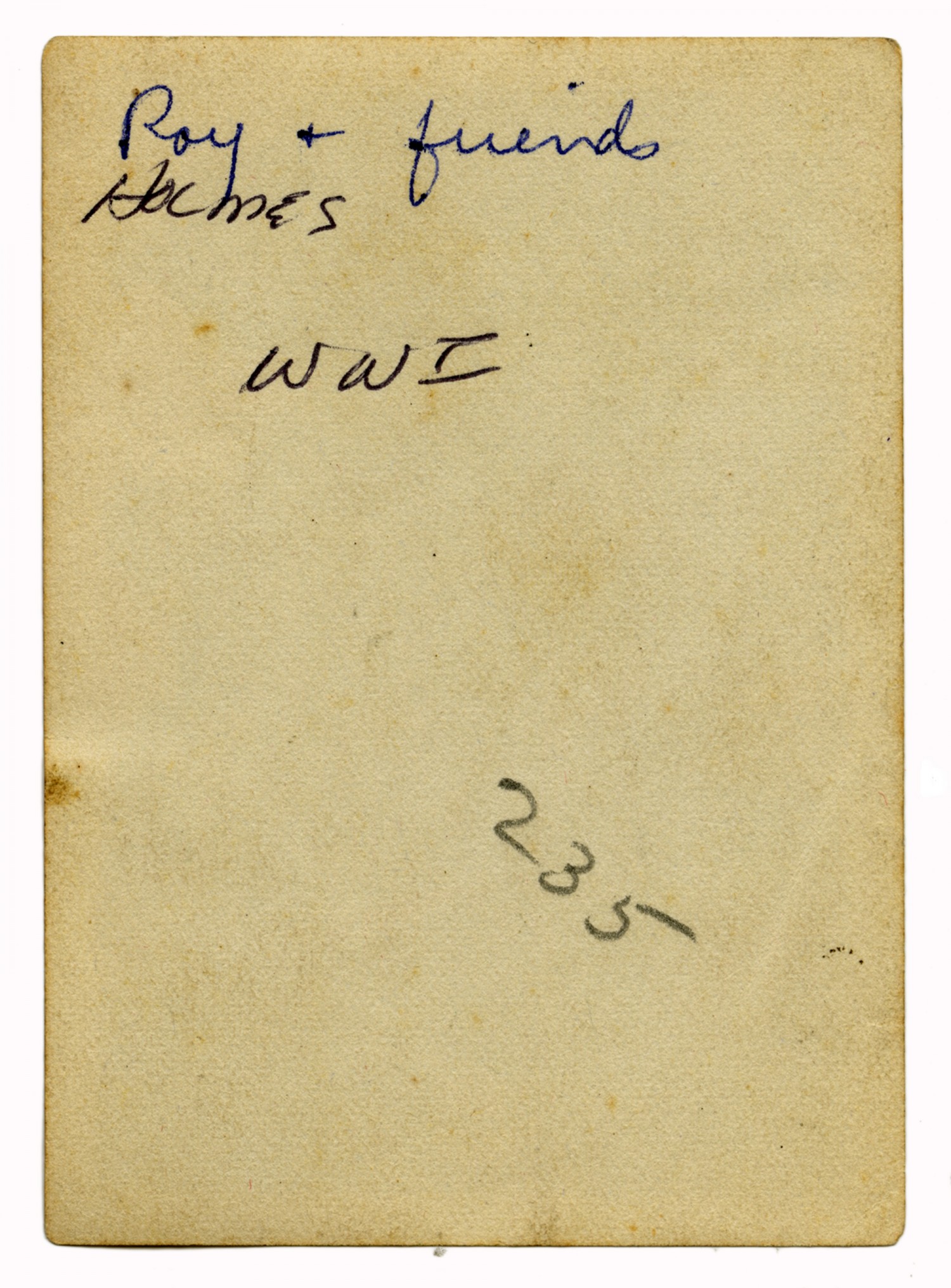 | Description | Photograph of Roy Holmes and two other soldiers during World War I. Roy is identified as the man on the far right with a small arrow at the bottom of the photograph. |
