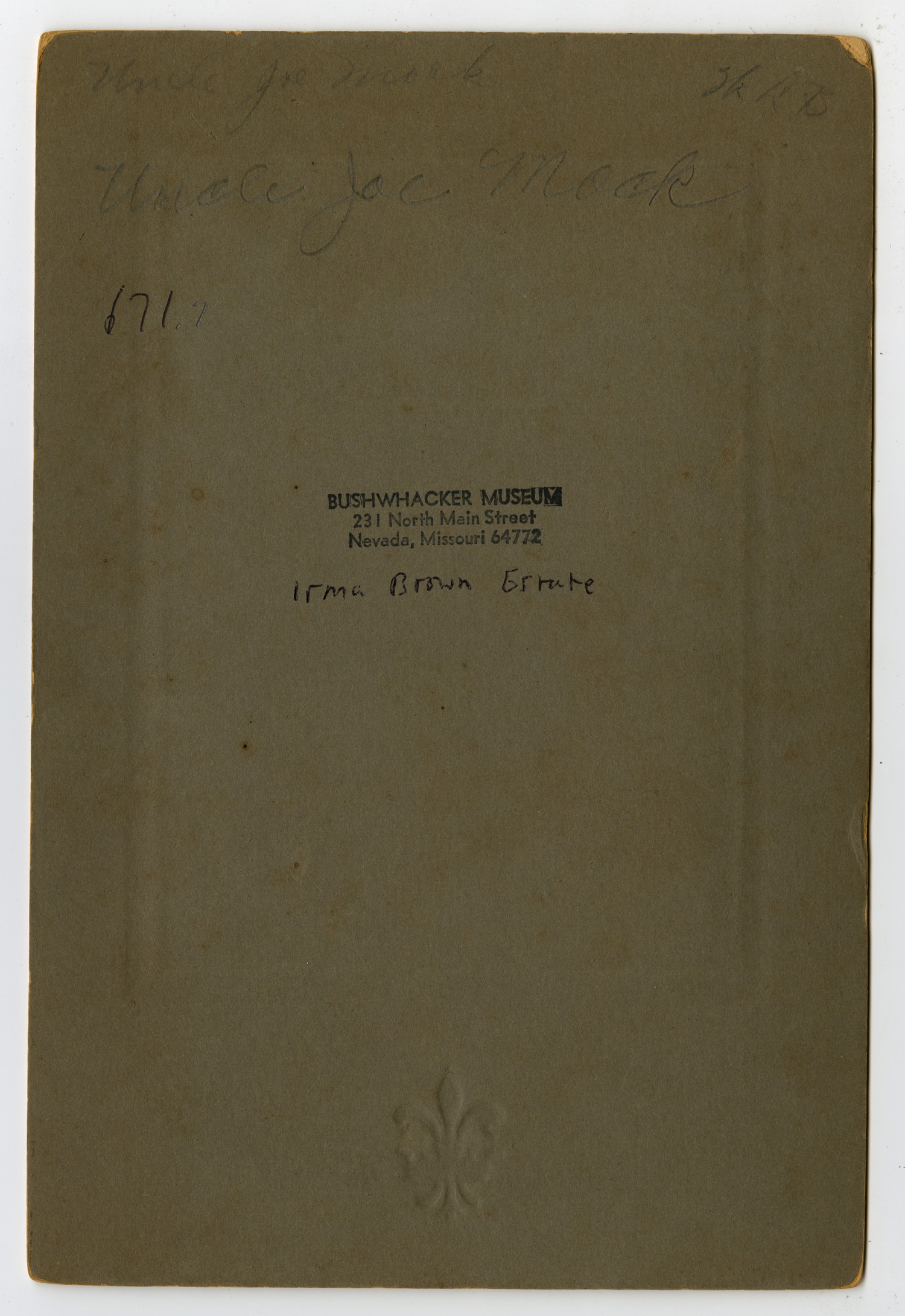 | Source | Unknown, Photograph of Uncle Joe Mack. n.d. Bushwhacker Museum World War I Collection. 671.7. Bushwhacker Museum, Nevada, Missouri. |