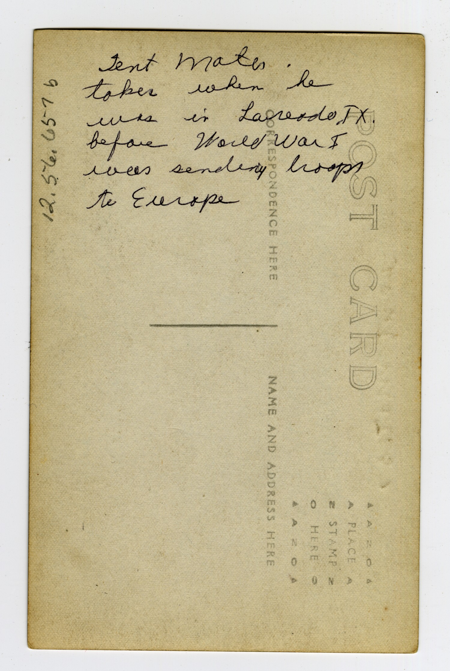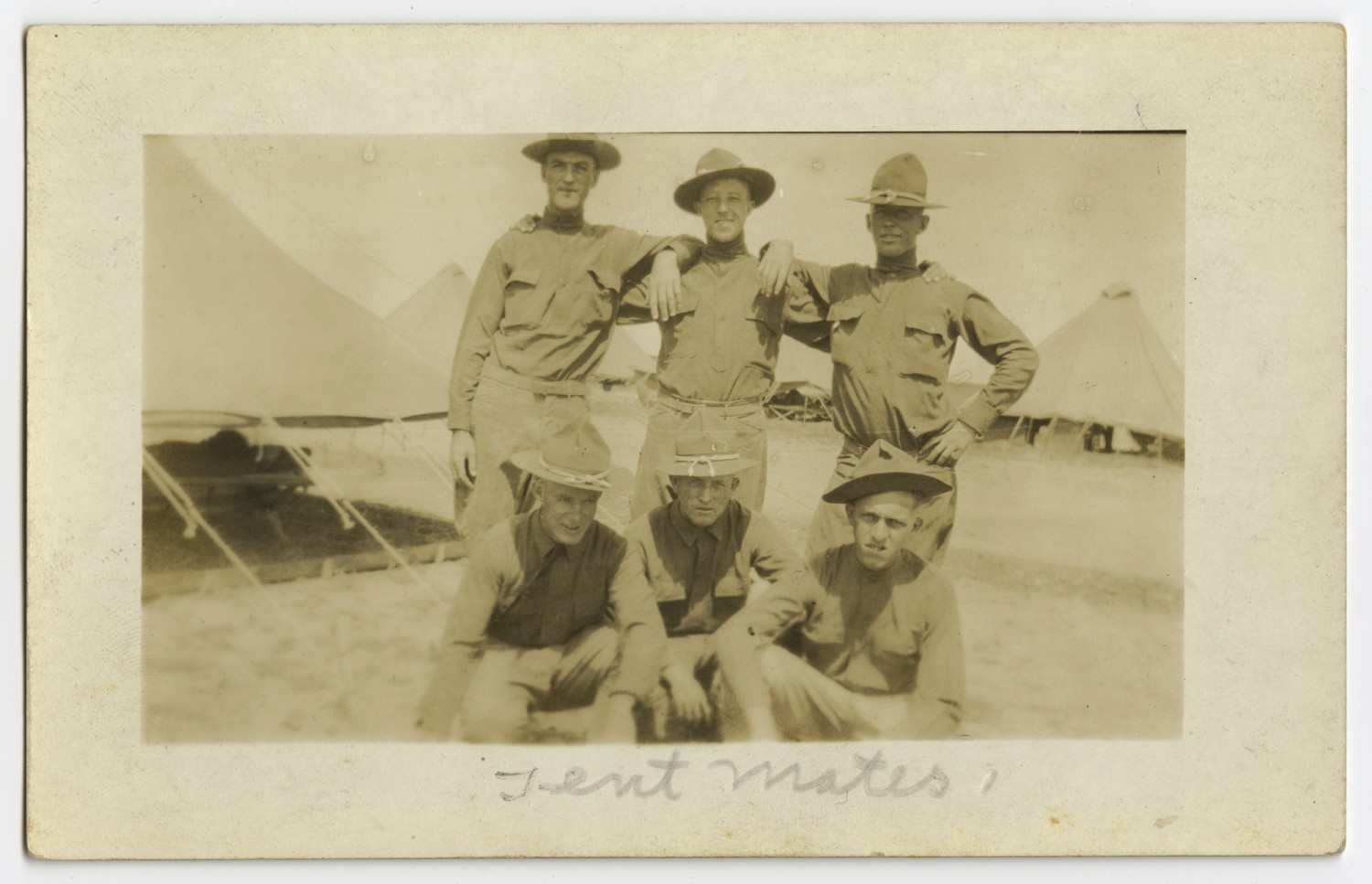 | Description | Postcard photograph of Emmet Tell and his tent mates taken in Laredo, Texas before he was sent to Europe. |