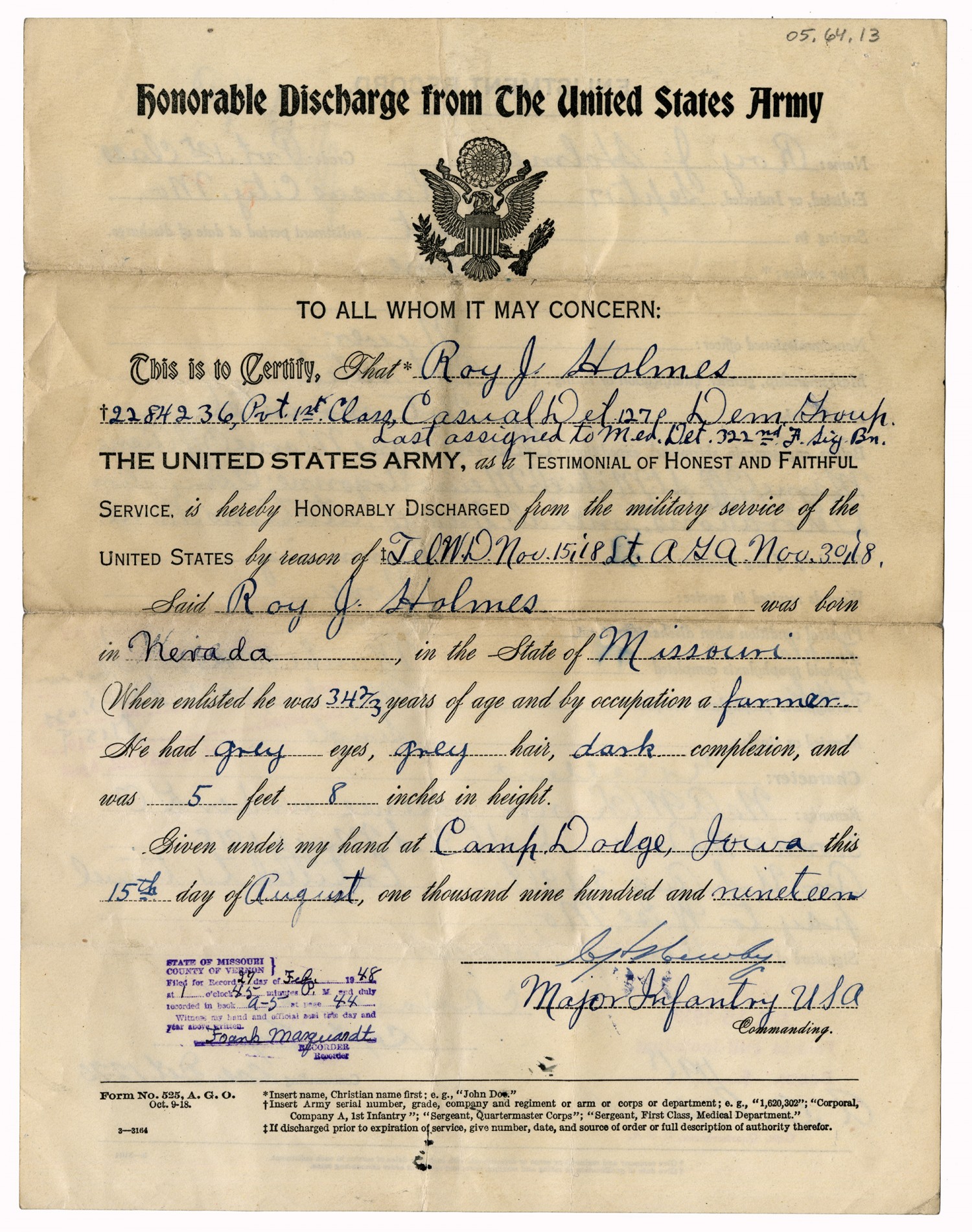 Honorable Discharge from The United States Army TO ALL WHOM IT MAY CONCERN: This is to Certify, That Roy J. Holmes 2284236, Pvt. 1st Class, Casual Det. 1270 Dem Group Last assigned to Med. Det 322nd F. Sig. Bn. THE UNITED STATES ARMY, as a TESTIMONIAL OF HONEST AND FAITHRUL SERVICE, is hereby HONORABLY DISCHARGED from the military service of the UNITED STATES by reason of Tel. W.D. [November] 15, [1918] Lt. AGA [November] 30, [1918] Said Roy J. Holmes was born in Nevada, in the State of Missouri When enlisted he was 34 2/3 years of age and by occupation a farmer. He had grey eyes, grey hair, dark complexion, and was 5 feet 8 inches in height. Given under my hand at Camp Dodge, Iowa this 15th day of August, one thousand nine hundred and nineteen [ms illegible: signature] Major Infantry USA Commanding. [stamp] STATE OF MISSOURI COUNTY OF VERNON} Filed for Record 27 day of [February] 1948 at 1 o