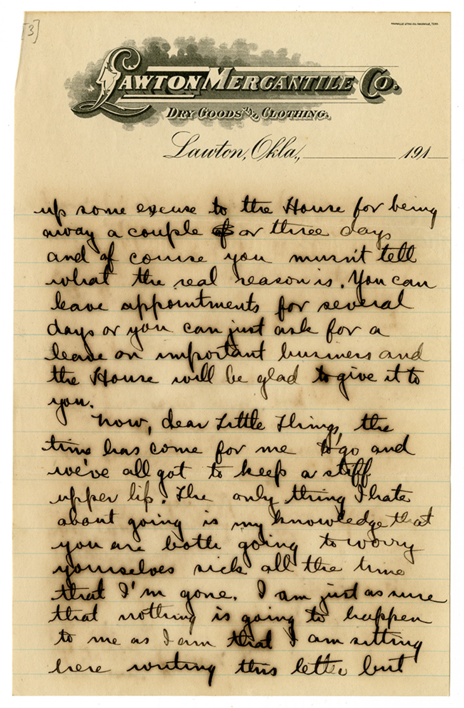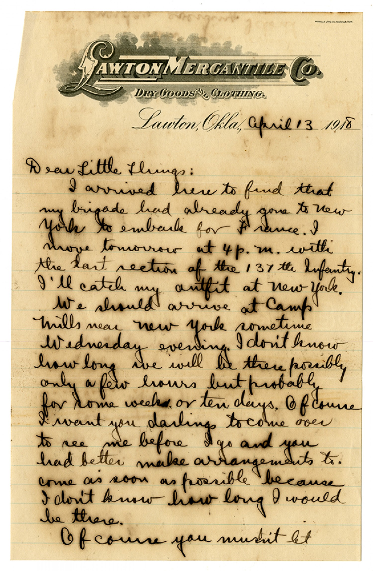 Lawton, [Oklahoma], April 13, 1918 Dear Little Things: I arrived here to find that my brigade had already gone to New York to embark for France. I move tomorrow at 4 p.m. with the last rection of the 137th Infantry. I'll catch my outfit at New York. We should arrive at Camp Mills near New York sometime Wednesday evening. I don't know how long we will be there possibly only a few hours but probably for some weeks or ten days. Of course I want you darlings to come over to see me before I go and you had better make arrangements to come as soon as possible because I don't know how long I would be there. Of course you musn't let