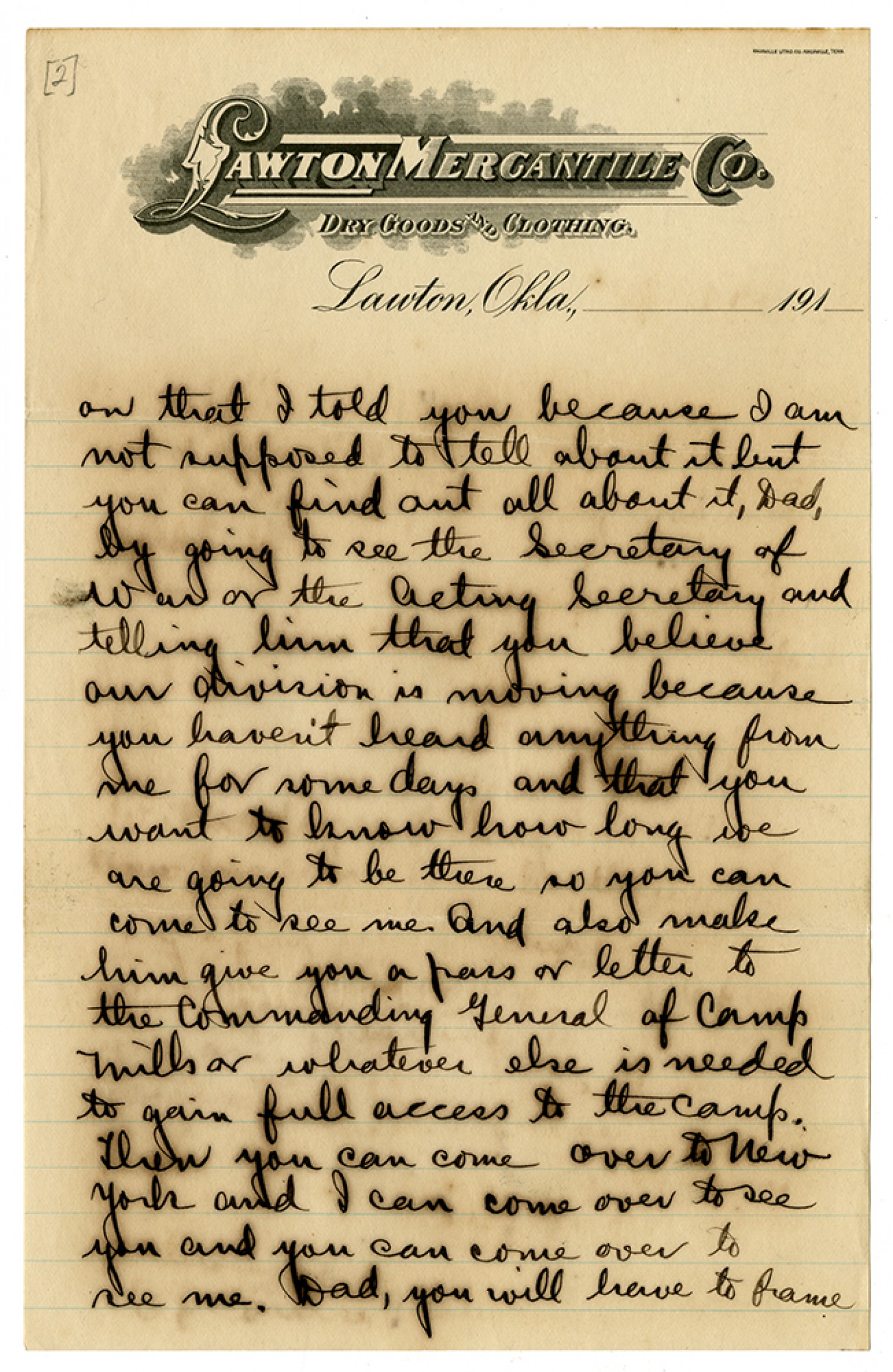 on that I told you because I am not supposed to tell about it but you can find out all about it, Dad, by going to see the Secretary of War or the Acting Secretary and telling him that you believe our division is moving because you haven't heard anything from me for some days and that you want to know how long we are going to be there so you can come to see me. And also make him give you a pass or letter to the commanding General of Camp Mills or whatever else is needed to gain full access to the camp. Then you can come over to New York and I can come over to see you and you can come over to see me. Dad, you will have to frame