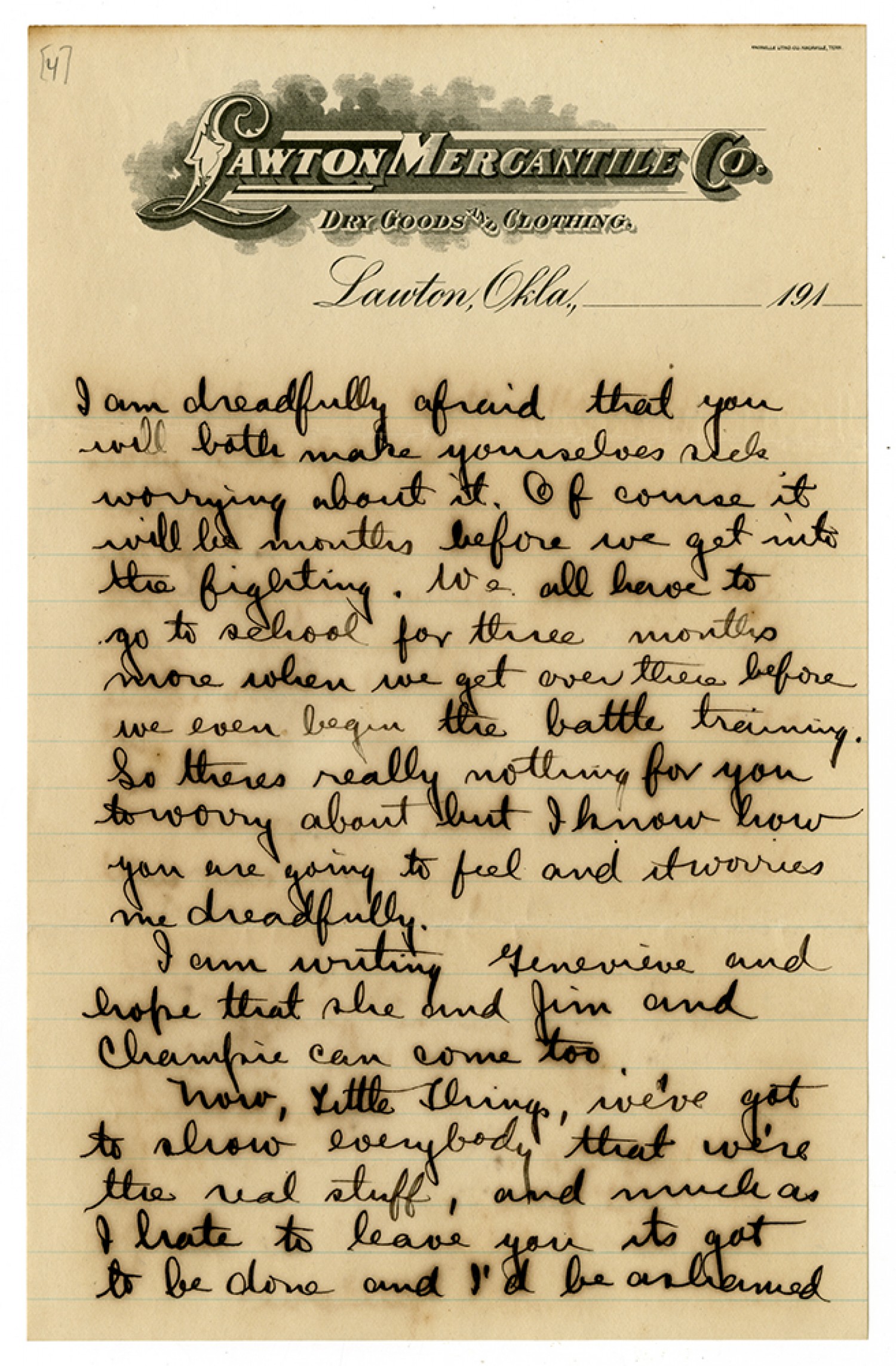 I am dreadfully afraid that you will both make yourselves sick worrying about it. Of course it will be months before we get into the fighting. We all have to go to school for three months more when we get over there before we even begin the battle training. So theres really nothing for you to worry about but I know how you are going to feel and it worries me dreadfully. I am writing Genevieve and hope that she and Jim and Champie can come too. Now, Little Things, we've got to show everybody that we're the real stuff, and much as I hate to leave you its got to be done and I'd be ashamed
