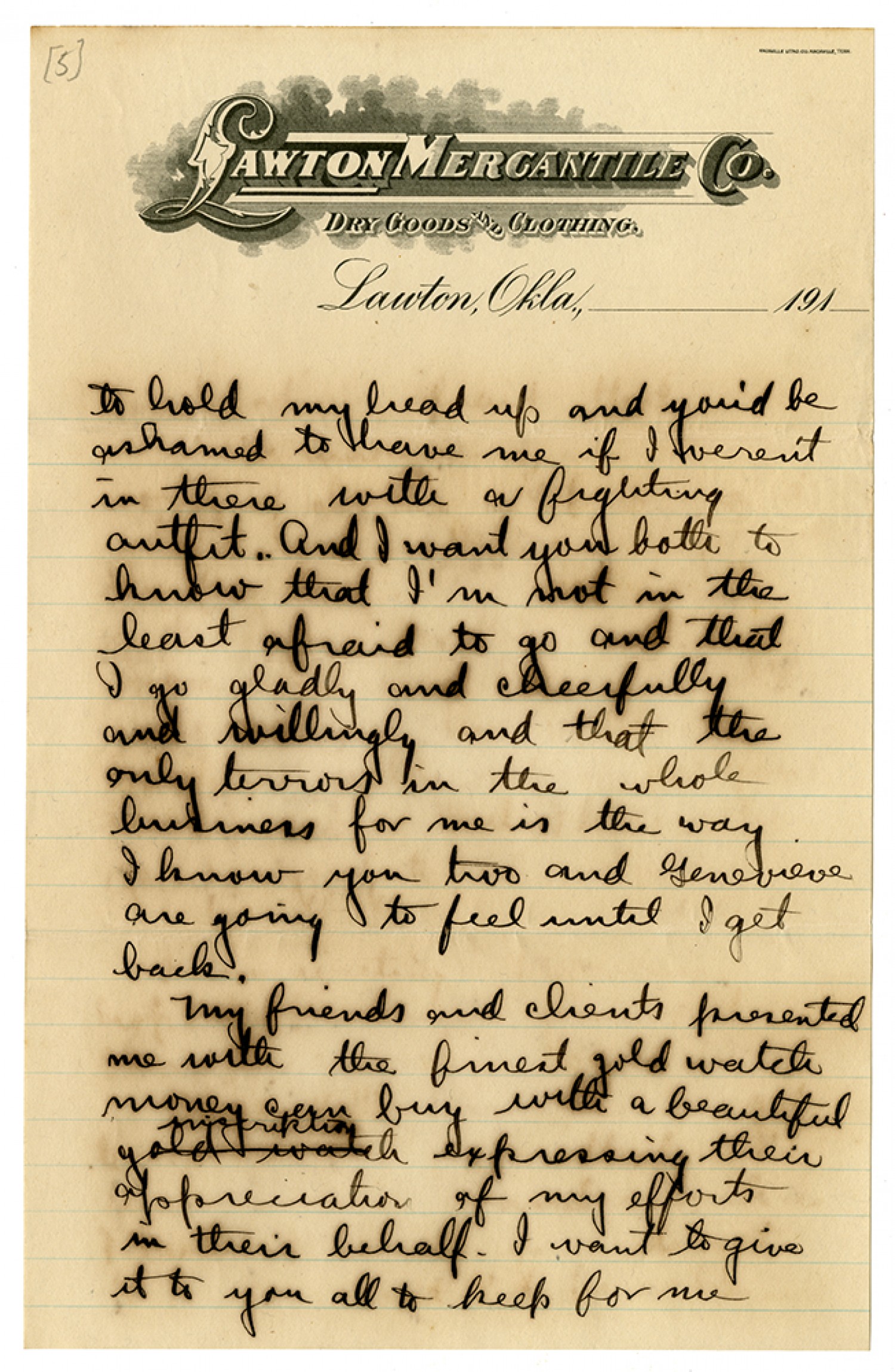 to hold my head up and you'd be ashamed to have me if I weren't in there with a fighting outfit. And I want you both to know that I'm not in the least afraid to go and that I go gladly and cheerfully and willingly and that the only terrors in the whole business for me is the way I know you two and Genevieve are going to feel until I get back. My friends and clients presented me with the finest gold watch money even buy with a beautiful inscription expressing their appreciation of my efforts in their behalf. I want to give it to you all to keep for me