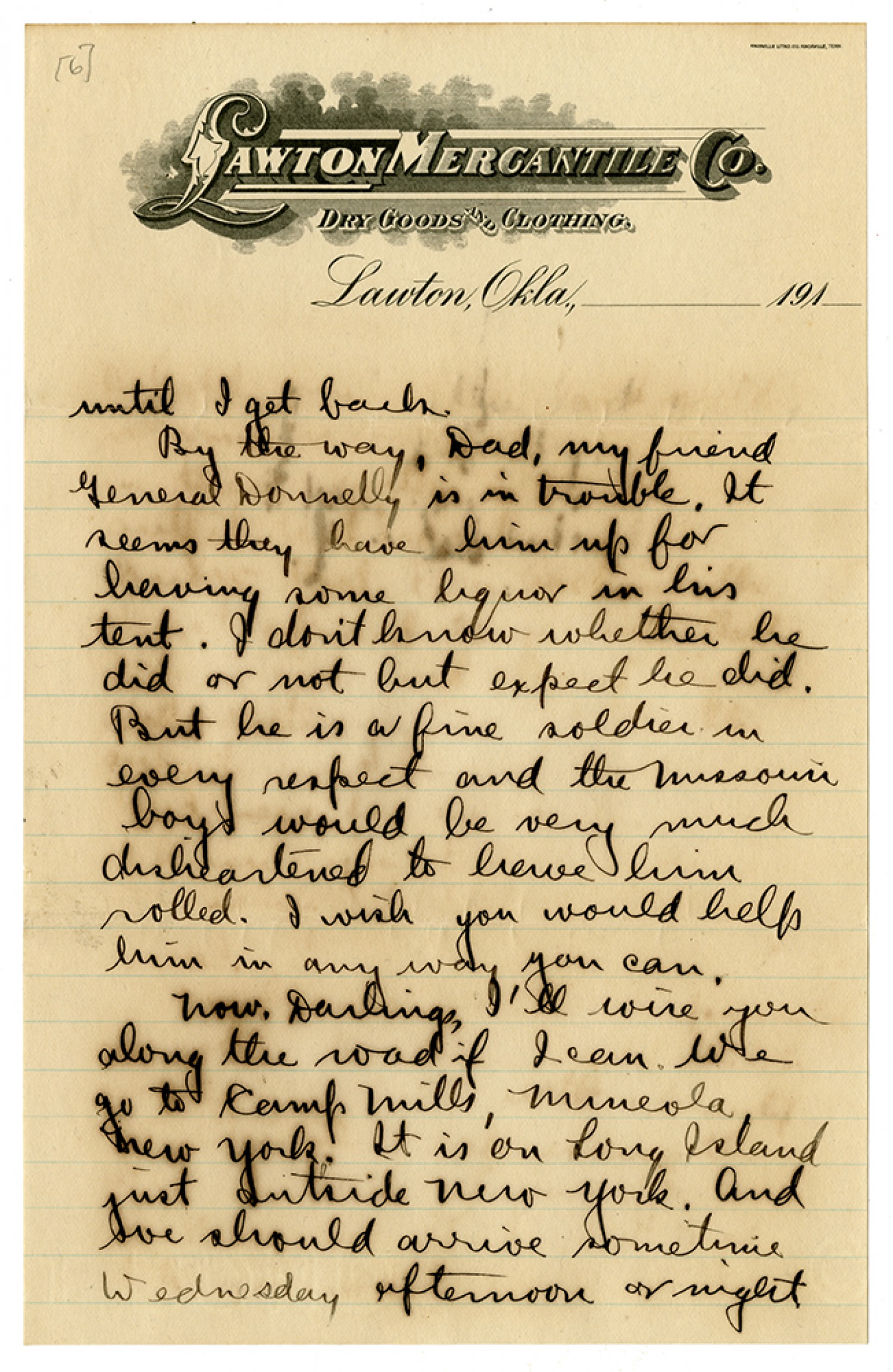 until I get back. By the way, Dad, my friend General Donnelly is in trouble. It seems they have him up for having some liquor in his tent. I don't know whether he did or not but expect he did. But he is a fine soldier in every respect and the Missouri boys would be very much disheartened to have him rolled. I wish you would help him in any way you can. Now, Darlings, I'll wire you along the road if I can. We go to Camp Mills, Mineola, New York. It is on Long Island just astride New York. And we should arrive sometime Wednesday afternoon or night