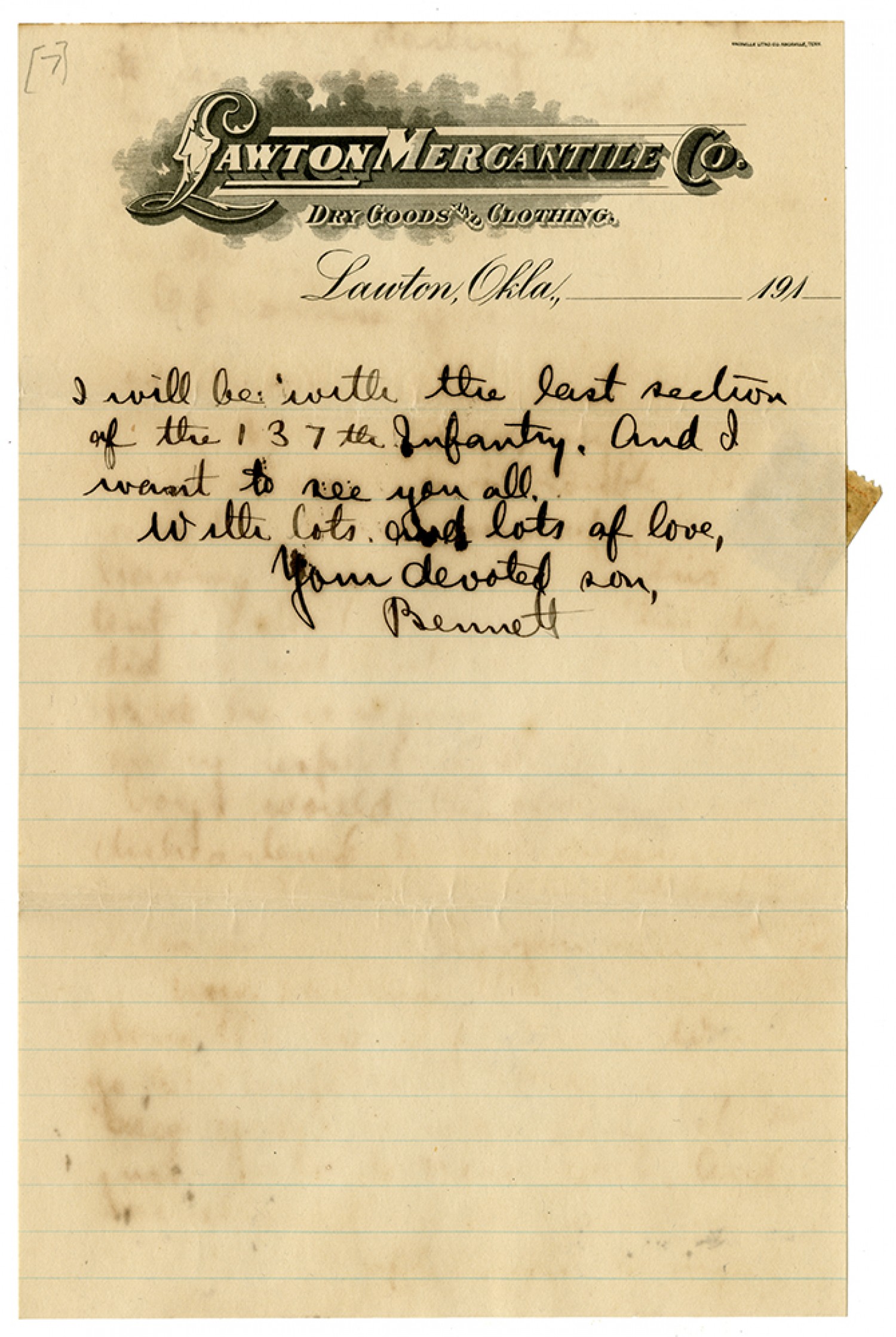 I will be with the last section of the 137th Infantry. And I want to see you all. With lots and lots of love, Your devoted son, Bennett
