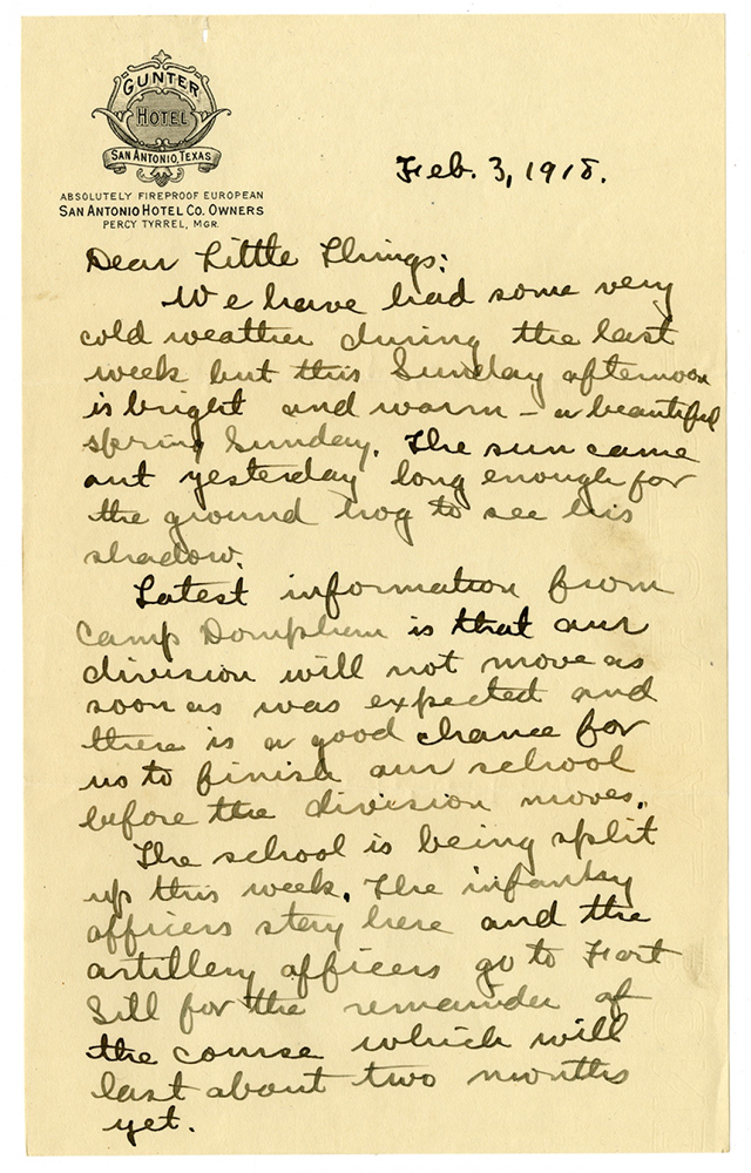 [February] 3, 1918. Dear Little Things: We have had some very cold weather during the last week but this Sunday afternoon is bright and warm – a beautiful spring Sunday. The sun came out yesterday long enough for the ground hog to see his shadow. Latest information from Camp Doniphan [Oklahoma] is that our division will not move as soon as was expected and there is a good chance for us to finish our school before the division moves. The school is being split up this week. The infantry officers stay here and the artillery officers go to Fort Sill [Oklahoma] for the remainder of the course which will last about two months yet.