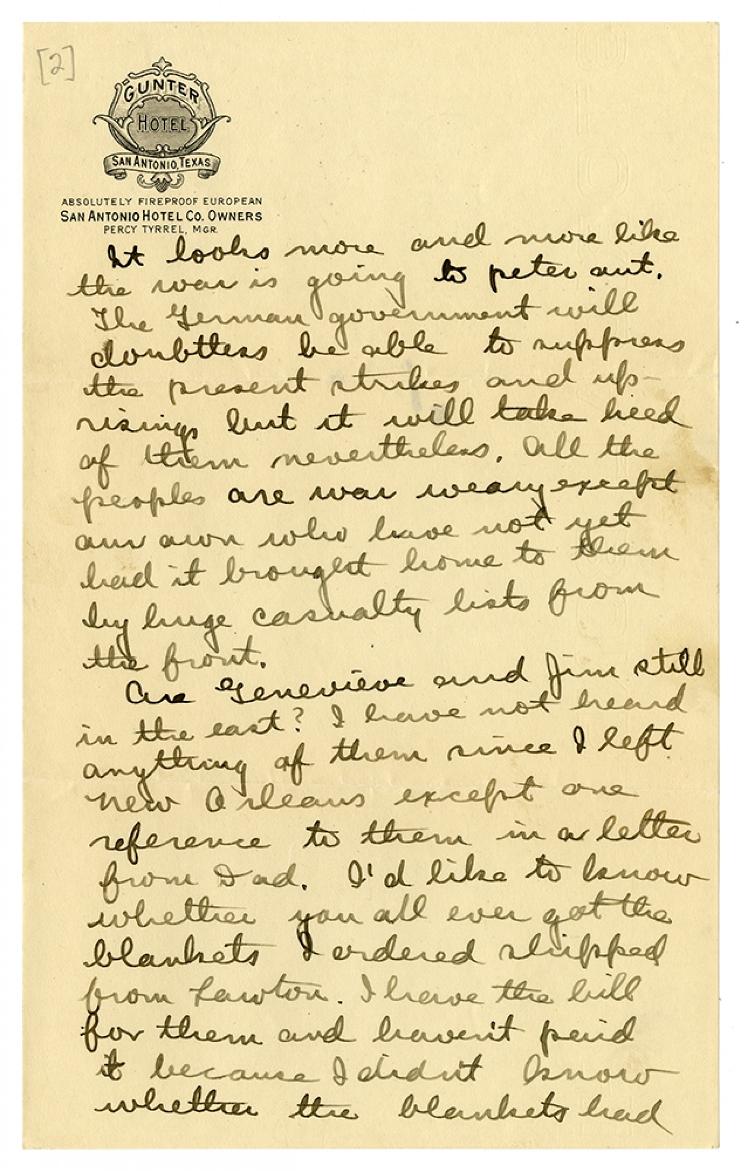 It looks more and more like the war is going to peter out. The German government will doubtless be able to suppress the present strikes and uprisings but it will take heed of them nevertheless. All the peoples are war weary except our own who have not yet had it brought home to them by huge casualty list from the front. Are Genevieve and Jim still in the east? I have not heard anything of them since I left New Orleans except one reference to them in a letter from Dad. I’d like to know whether you all ever got the blankets I ordered shipped from Lawton [Oklahoma]. I have the bill for them and haven’t paid it because I didn’t know whether the blankets had