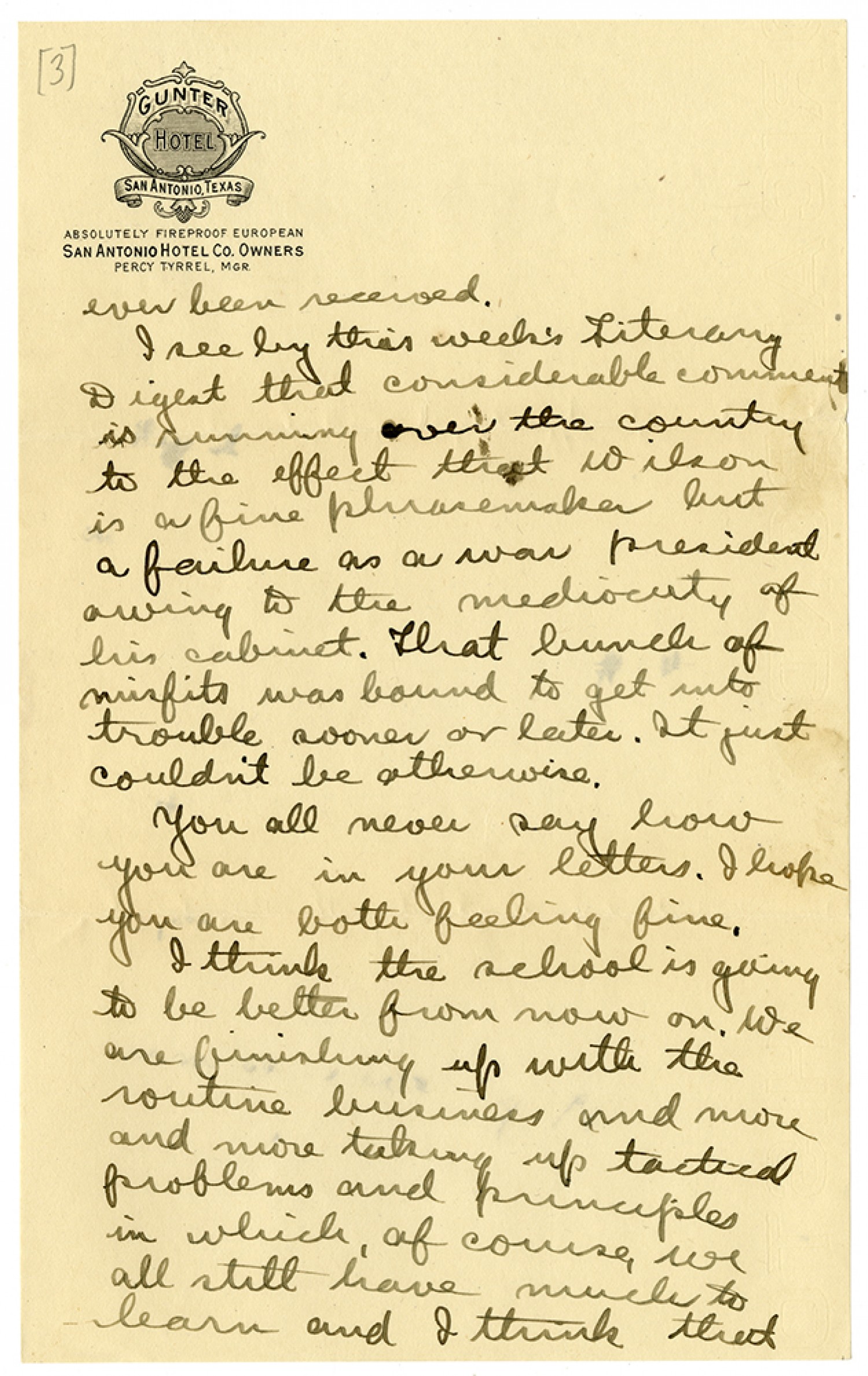 even been received. I see by this week’s Literary Digest that considerable comment is running over the country to the effect that Wilson is a fine peacemaker but a failure as a war President owing to the mediocrity of his cabinet. That bunch of misfits was bound to get into trouble sooner or later. It just couldn’t be otherwise. You all never say how you are in your letters. I hope you are both feeling fine. I think the school is going to be better from now on. We are finishing up with the routine business and more and more take up tactical problems and principles in which, of course, we all still have much to learn and I think that