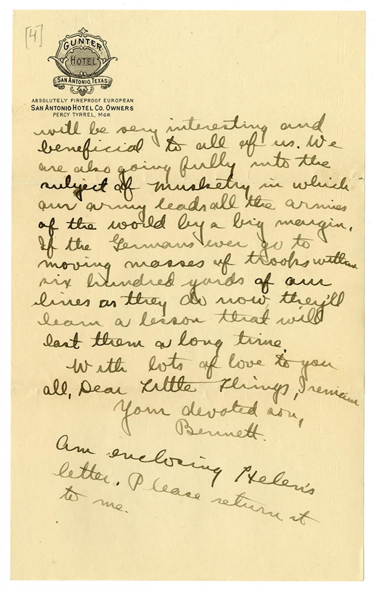 will be very interesting and beneficial to all of us. We are also going fully into the subject of musketry in which our army leads all the armies of the world by a big margin. If the Germans ever go to moving masses of troops within six hundred yards of our lines as they do now they’ll learn a lesson that will last them a long time. With lots of love to you all, Dear Little Things, I remain Your devoted son, Bennett. Am enclosing Helen’s letter. Please return it to me.