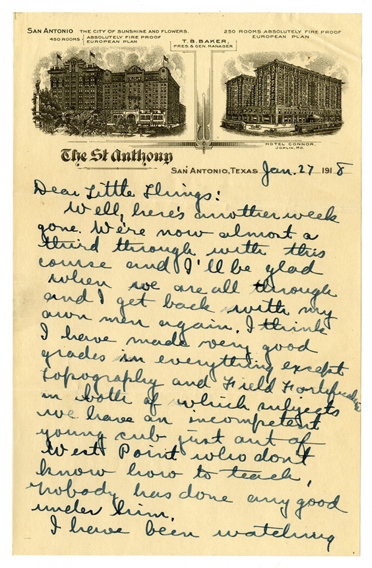 SAN ANTONIO, TEXAS [January 27, 1918] Dear Little Things: Well here’s another week gone. We’re now almost a third through with this course and I’ll be glad when we are all through and I get back with my own men again. I think I have made very good grades in everything except topography and Field Fortification in both of which subjects we have an incompetent young cub just out of West Point who don’t know how to teach, nobody has done any good under him. I have been watching