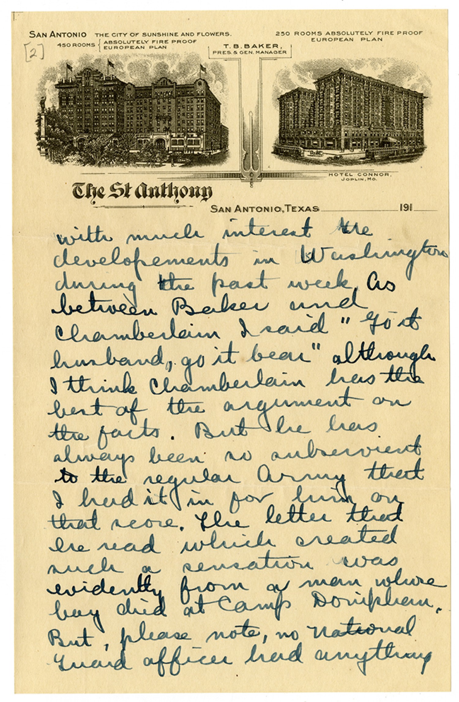 with much interest the developments in Washington during the past week as between Baker and Chamberlain I said “Go it husband, go it bear” although I think Chamberlain has the best of the argument on the facts. But he has always been so subservient to the regular Army that I had it in for him on that score. The letter that he read which created such a sensation was evidently from a man whose boy died at Camp Doniphan [Oklahoma]. But, please note , no National Guard officer had anything