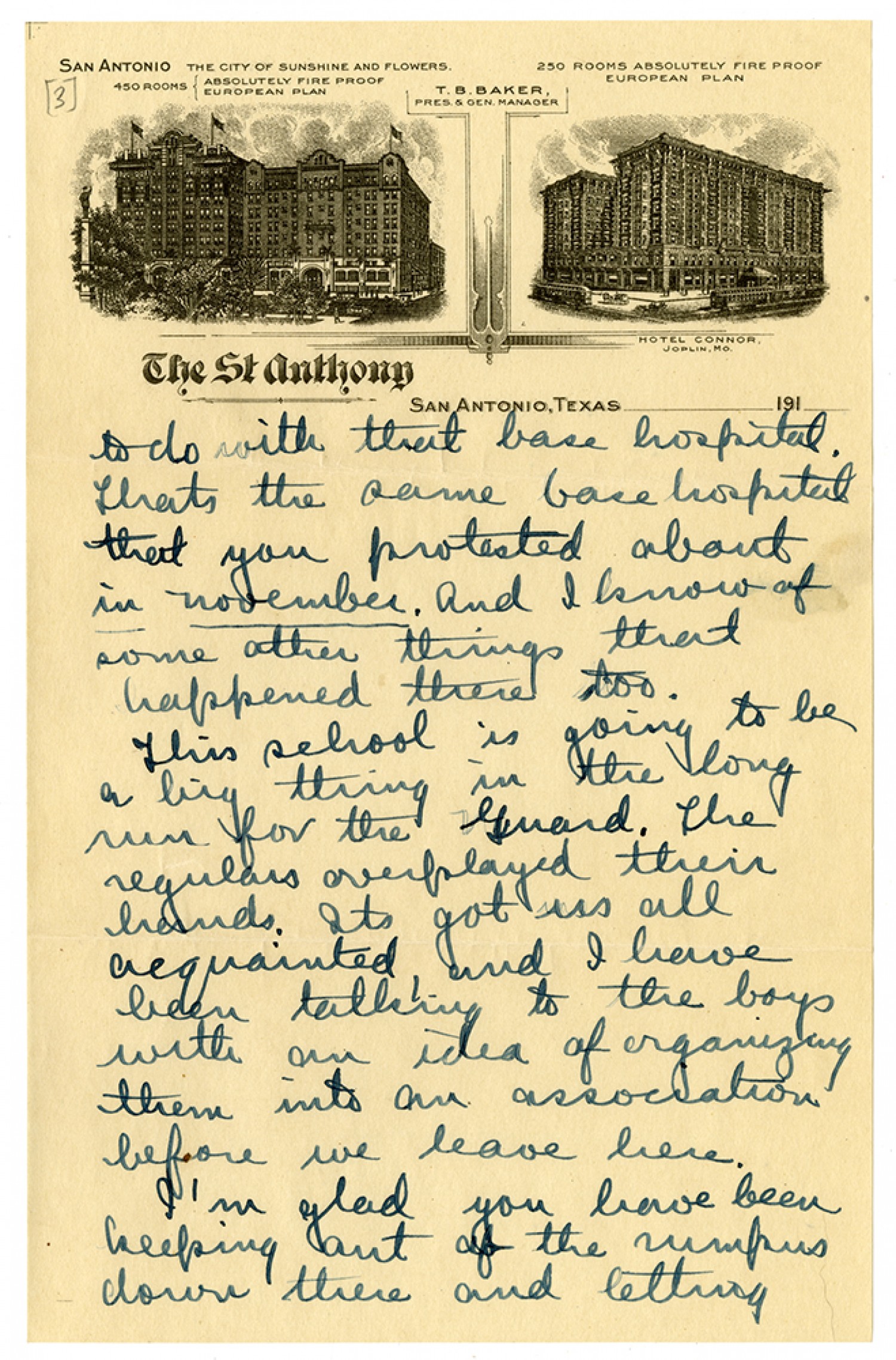 to do with that base hospital. Thats the same base hospital that you protested about in November. And I know of some other things that happened there too. This school is going to be a big thing in the long run for the Guard. The regulars overplayed their hands. Its got us all acquainted, and I have been talking to the boys with an idea of organizing them into an association before we leave here. I’m glad you have been keeping out of the rumpus down there and letting