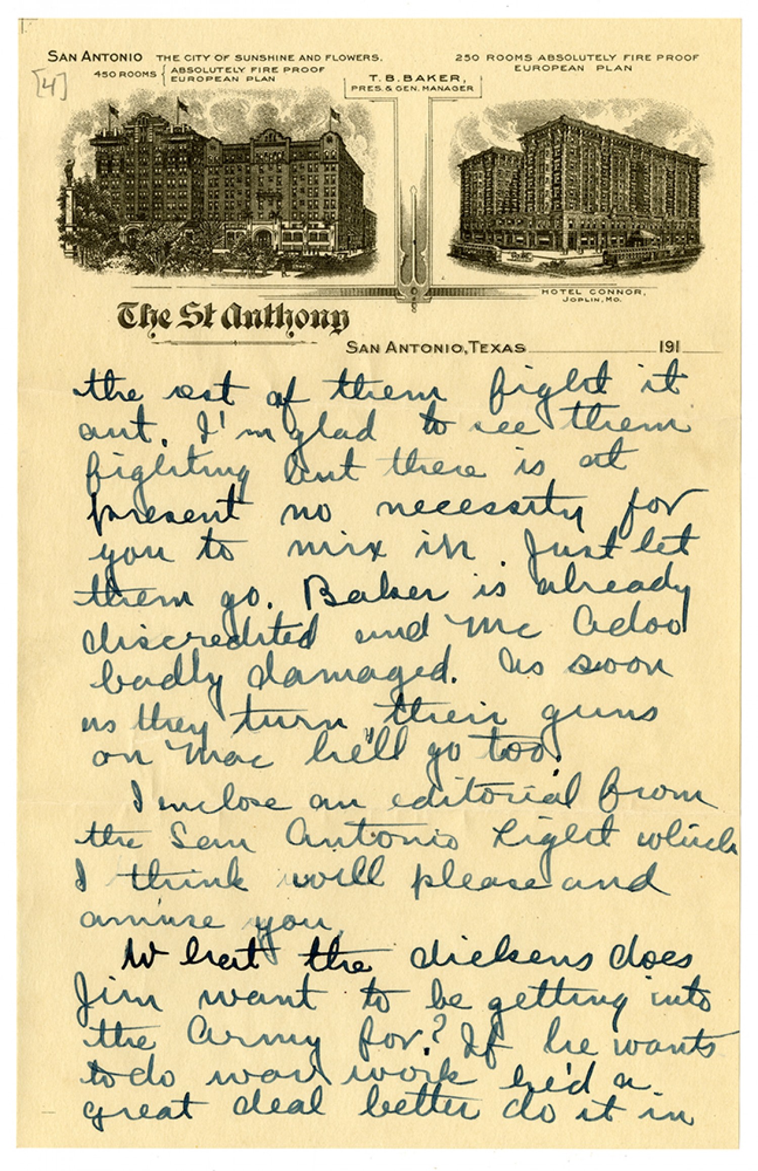 the rest of them fight it out. I’m glad to see them fighting but there is at present no necessity for your to mix in. Just let them go. Baker is already discredited and McAdoo badly damaged. As soon as they turn their guns on Mac he’ll go too. I enclose an editorial from the San Antonio Light which I think will please and amuse you. What the dickens does Jim want to be getting into the Army for? If he wants to do war work he’d a great deal better do it in