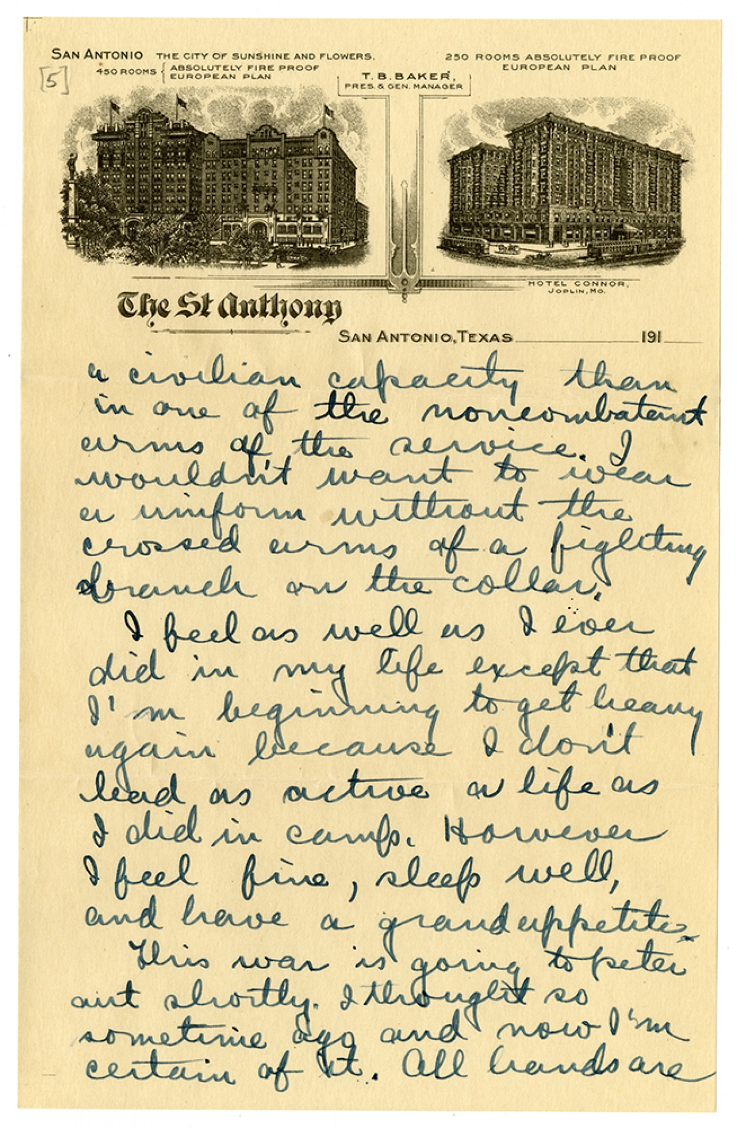 a civilian capacity than in one of the noncombatant arms of the service. I wouldn’t want to wear a uniform without the crossed arms of a fighting branch on the collar. I feel as well as I ever did in my life except that I’m beginning to get heavy again because I don’t lead as active a life as I did in camp. However I feel fine, sleep well, and have a grand appetite. This war is going to peter out shortly. I thought so sometime ago and now I’m certain of it. All hands are
