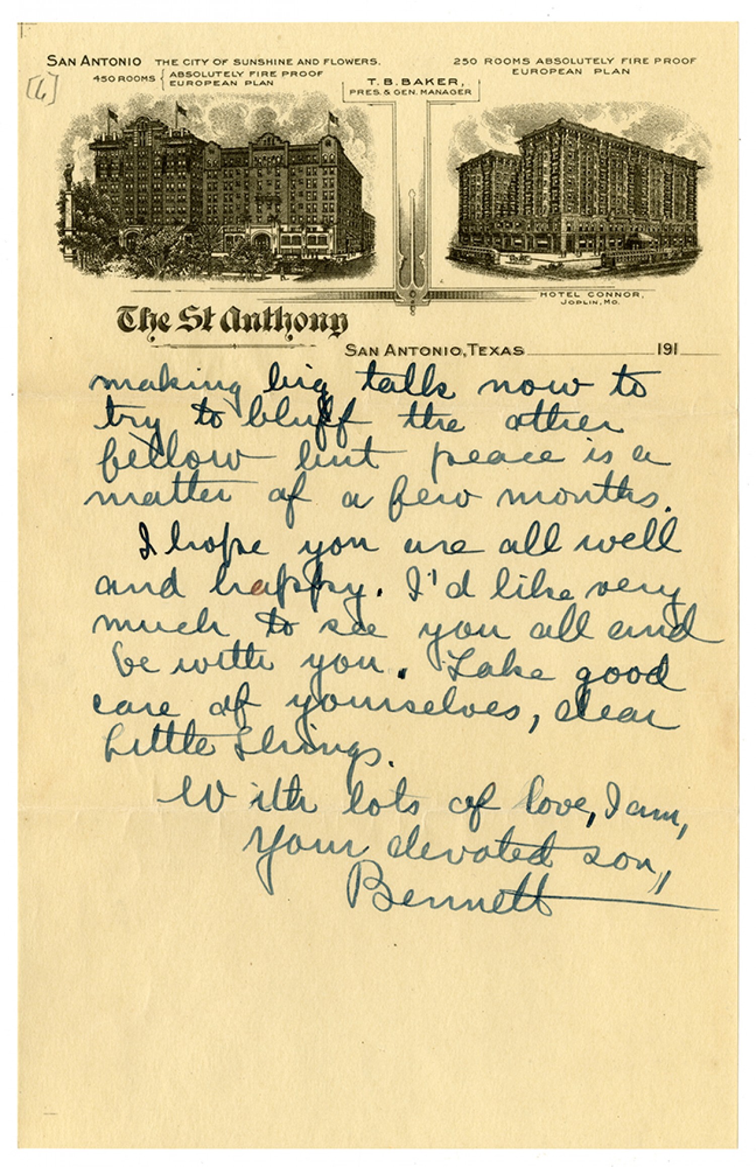 making big talk now to try to bluff the other fellow but peace is a matter of a few months. I hope you are all well and happy. I’d like very much to see you all and be with you. Take good care of yourselves, dear Little Things With lots of love, I am your devoted son, Bennett