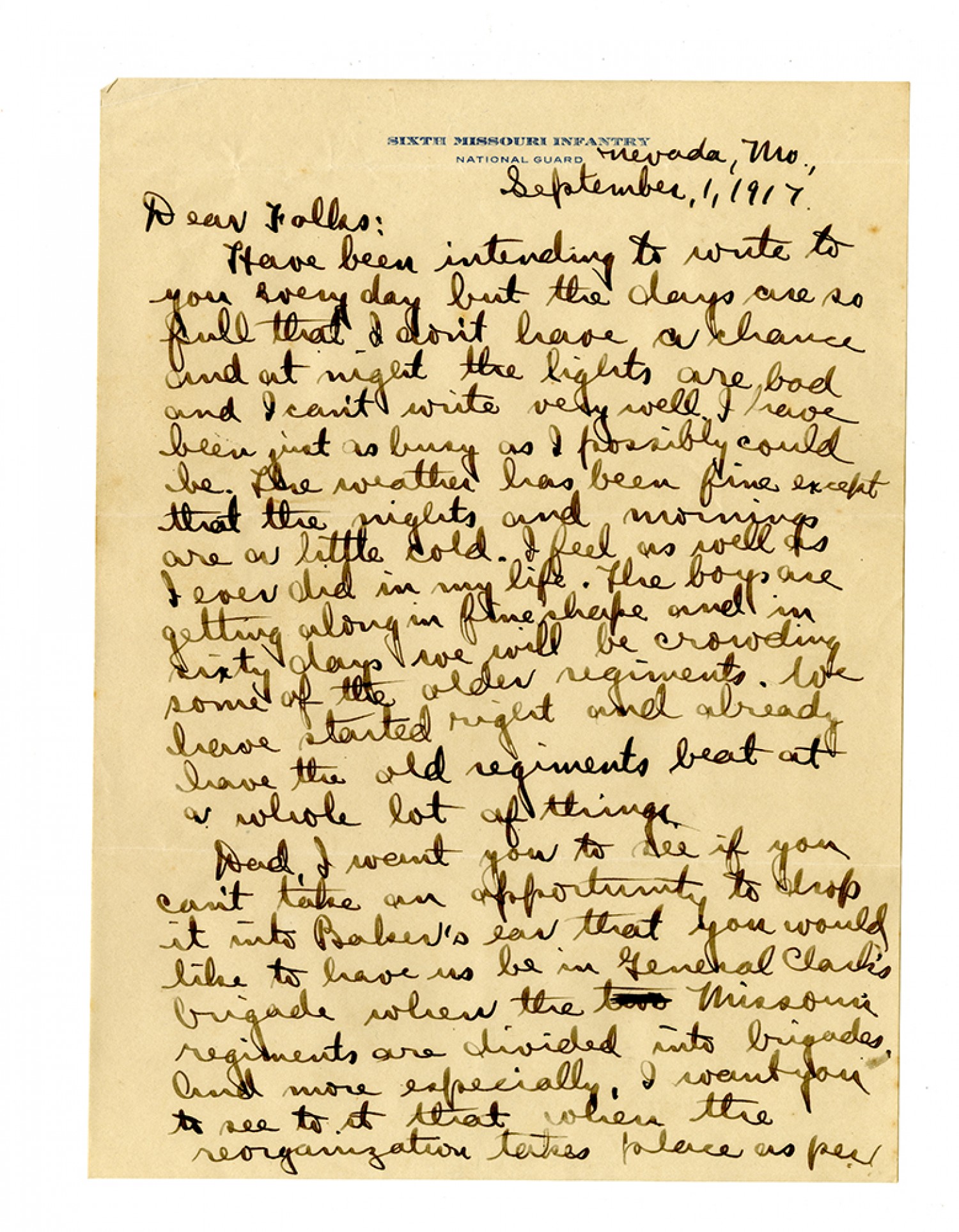 Nevada [Missouri] September, 1, 1917. Dear Folks: Have been intending to write to you everyday but the days are so full that I don’t have a chance and at night the lights are bad and I can’t write very well. I have been just as busy as I possibly could be. The weather has been fine except that the nights and mornings are a little cold. I feel as well as I ever did in my life, The boys are getting along in fine shape and in sixty days we will be crowding some of the older regiments. We have started right and already have the old regiments beat at a whole lot of things. Dad, I want you to see if you can’t take an opportunity to drop it into Baker’s ear that you would like to have us be in General Clark’s brigade when the Missouri regiments are divided into brigades and more especially, I want you to see to it that when the reorganization takes place as per