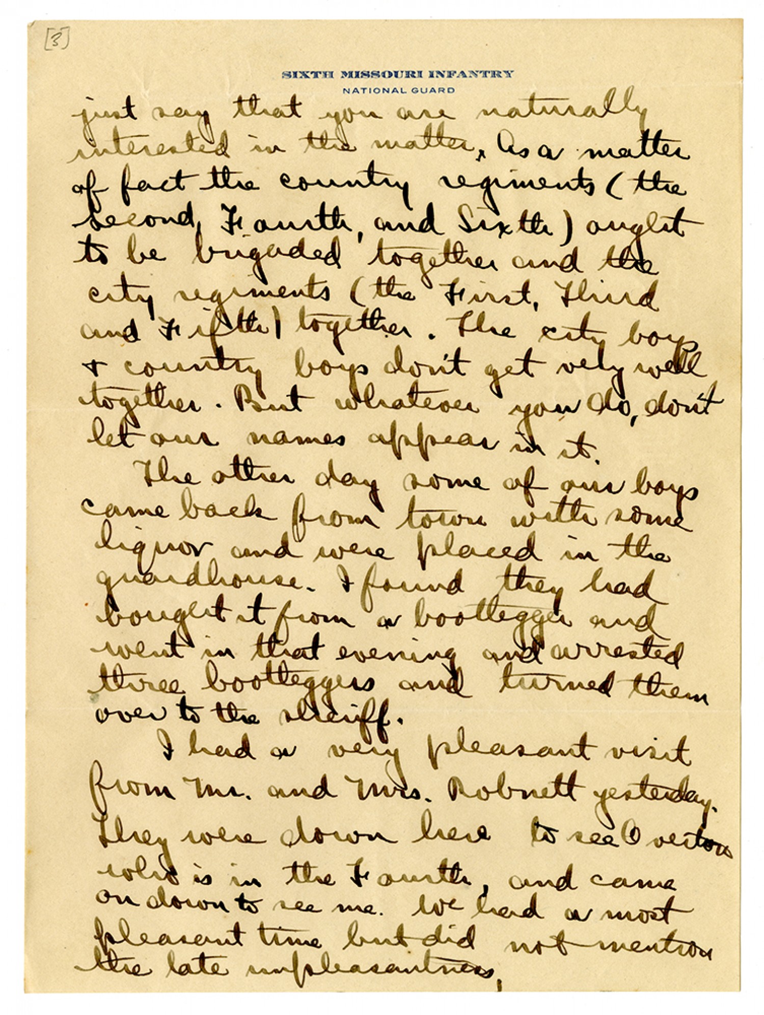 [page 3] just say that you are naturally interested in the matter, as a matter of fact the country regiments (the Second, Fourth, and Sixth) ought to be brigaded together, and the city regiments (the First, Third and Fifth) together. The city boys & country boys don’t get very well together. But whatever you do, don’t let our names appear in it. The other day some of our boys came back from town with some liquor and were placed in the guardhouse. I found they had bought it from a bootlegger and went in that evening and arrested three bootleggers and turned them over to the sheriff. I had a very pleasant visit from Mr. and Mrs. Robnett yesterday. They were down here to see Overton who is in the Fourth and came on down to see me. We had a most pleasant time but did not mention the late unpleasantness.