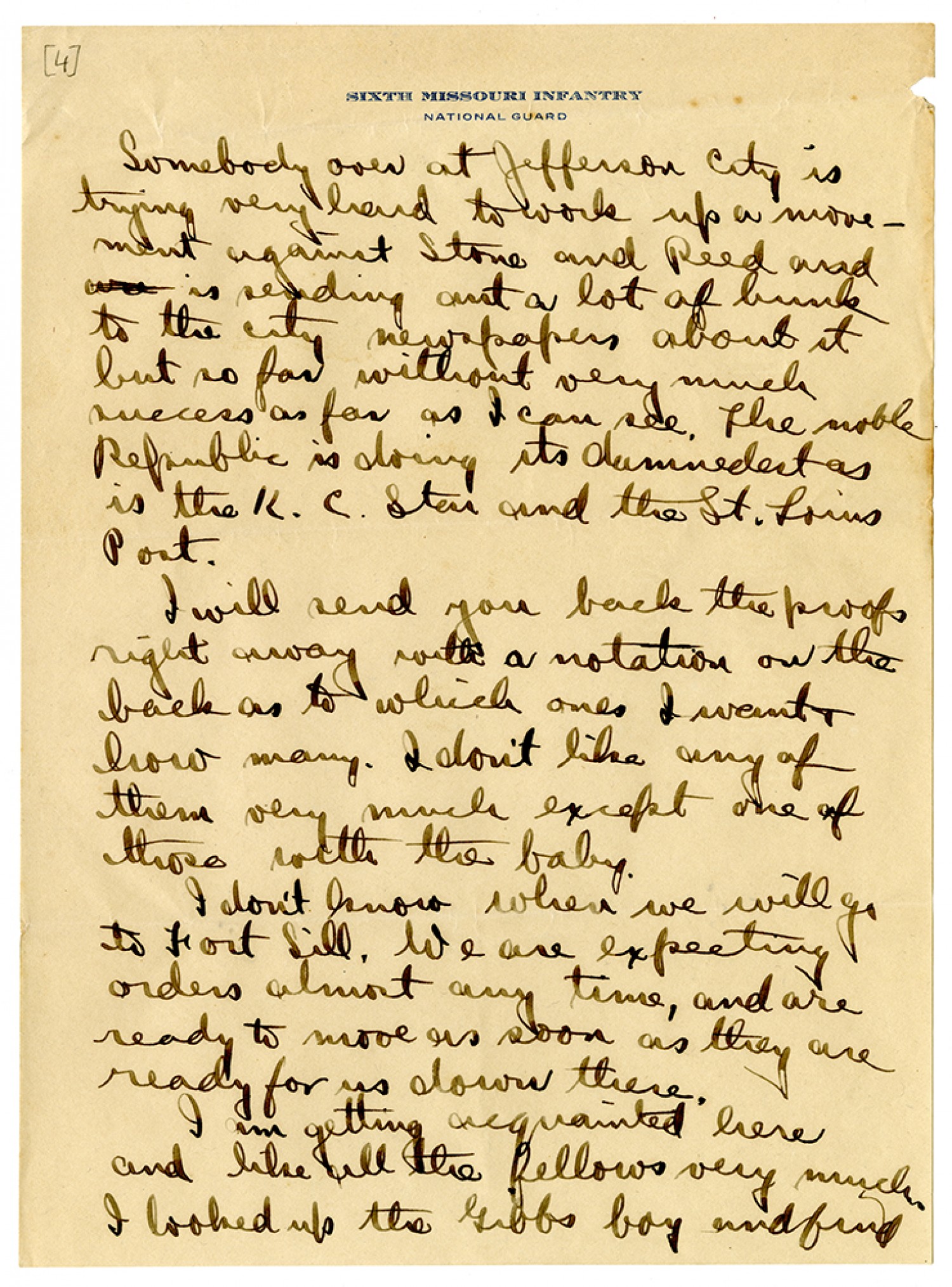 [page 4] Somebody over at Jefferson City is trying hard to work up a movement against Stone and Reed and is sending out a lot of bunk to the city newspapers about it but so far without very much success as far as I can see. The noble Republic is doing its damndest as it the [Kansas City] Star and the St. Louis Post. I will send you back the proofs right away with a notation on the back as to which ones I want and how many. I don’t like any of them very much except one of those with the baby. I don’t know when we will go to Fort Sill [Oklahoma]. We are expecting orders almost any time, and are ready to move as soon as they are ready for us down there. I am getting acquainted here and like all the fellows very much I looked up the Gibbs boy and find
