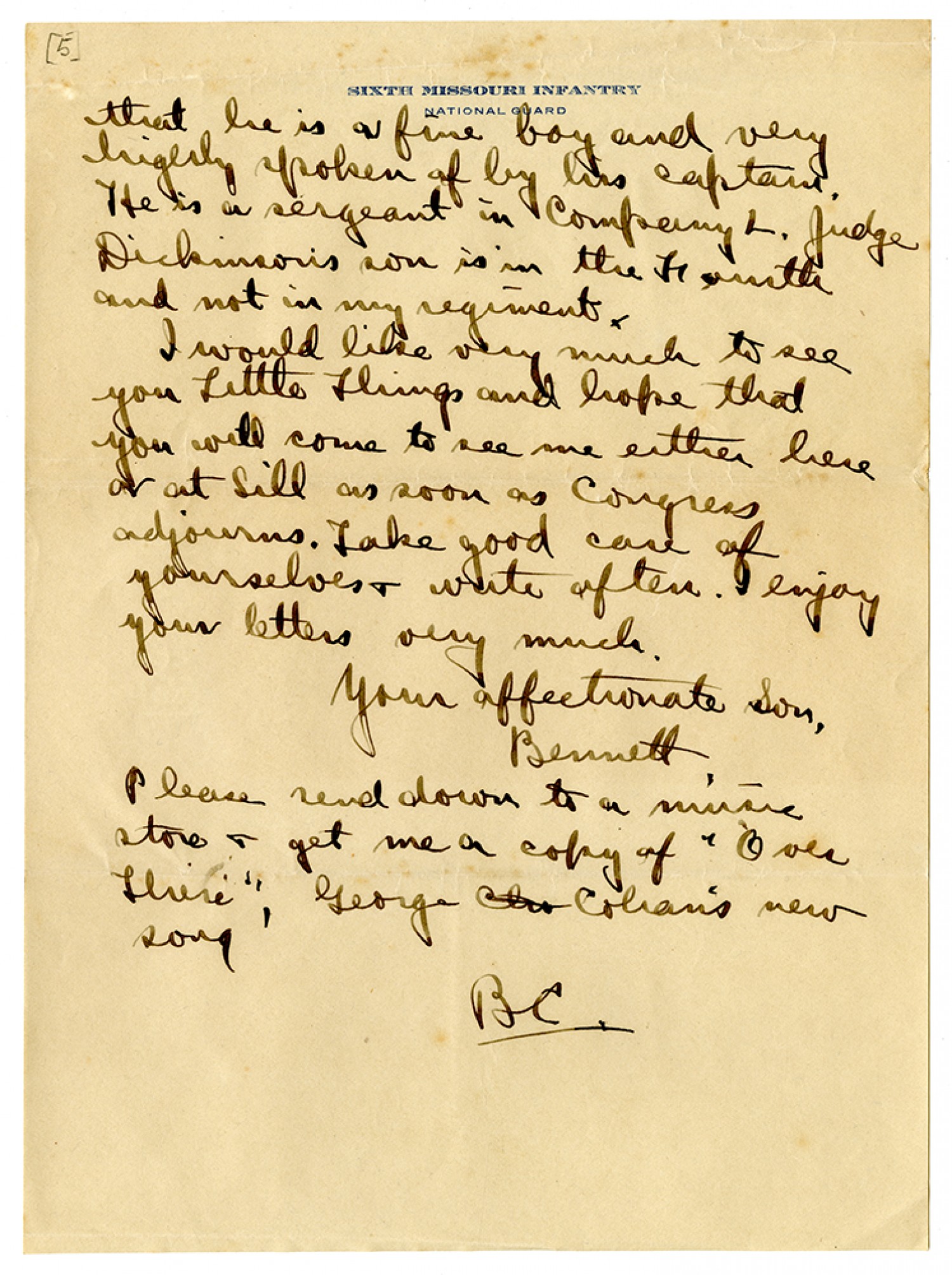 [page 5] that he is a fine boy and very highly spoken of by his captain. He is a sergeant in Company L. Judge Dickersons son is in the Fourth and not in my regiment. I would like very much to see you Little Things and hope that you will come to see me either here or at [Fort Sill] [Oklahoma] as soon as Congress adjourns. Take good care of yourselves and write often. I enjoy your letters very much. Your affectionate Son Bennett Please send down to a music store & get me a copy of “Over There” George Cohans new song BC.