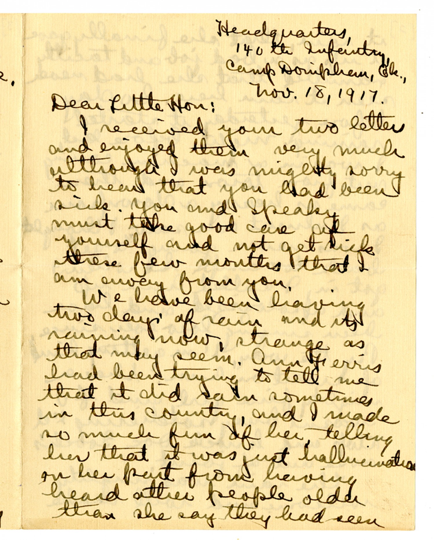 Headquarters, 140th Infantry Camp Doniphan, [Oklahoma] [November]18, 1917. Dear Little Hon: I received your two letters and enjoyed them very much although I was mighty sorry to hear that you had been sick. You and Speaker must take good care of yourself and not get sick these few months that I am away from you. We have been having two days of rain and its raining now, strange as that may seem. Ann Ferris had been trying to tell me that it did rain sometimes in this country, and I made so much fun of her telling her that it was just hallucination on her part from having heard other people older than she say they had seen