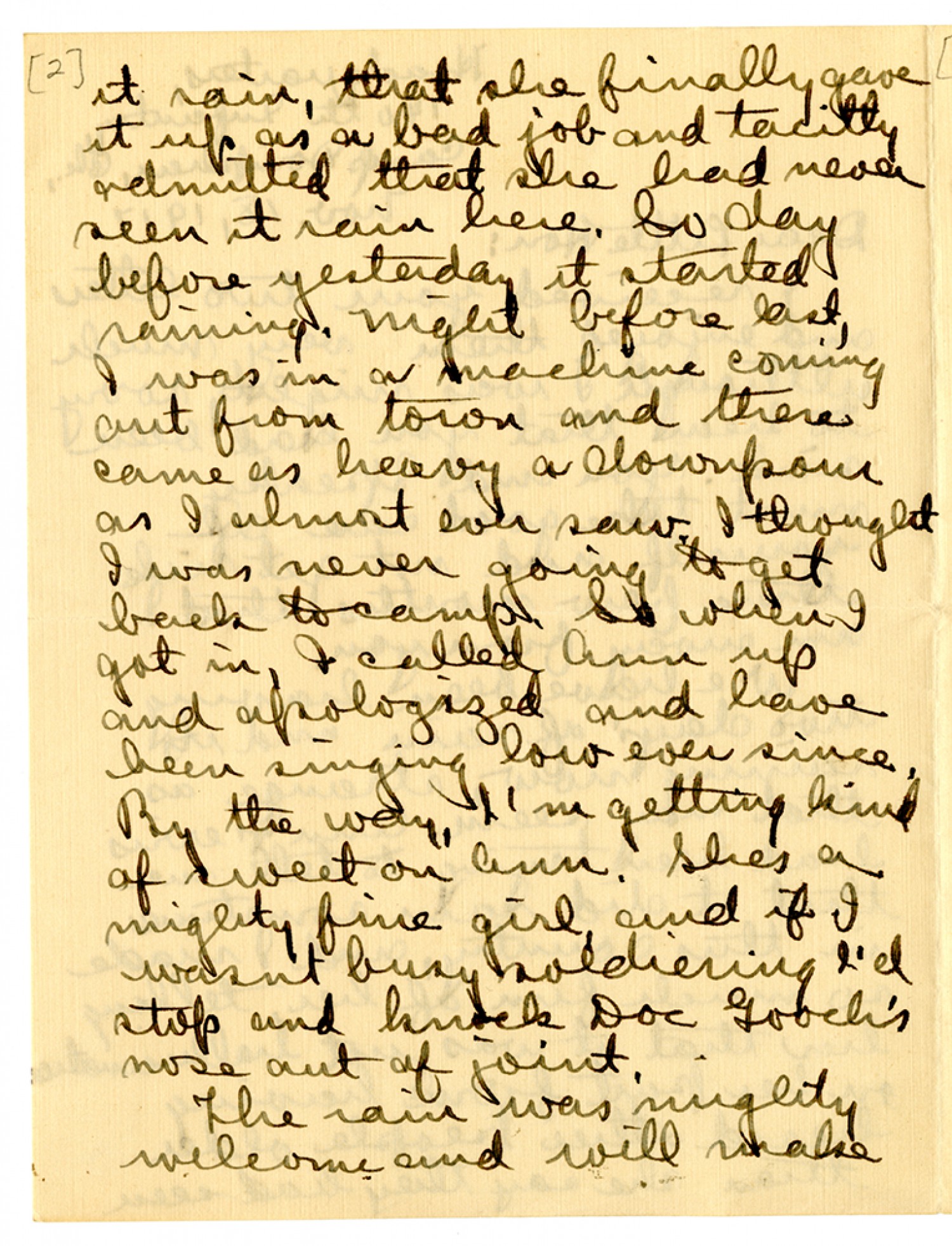 [page 2] it rain, that she finally gave it up as a bad job and tacitly admitted that she had never seen it rain here. So day before yesterday, it started raining. Night before last, I was in a machine coming out from town and there came as heavy a downpour as I almost ever saw I thought I was never going to get back to camp. So when I got in, I called Ann up and apologized and have been singing low ever since. By the way, I’m getting kind of sweet on Ann. Shes a mighty fine girl, and if I wasn’t busy soldiering I’d stop and knock Doc Gooch’s nose out of joint. The rain was mighty welcome and will make