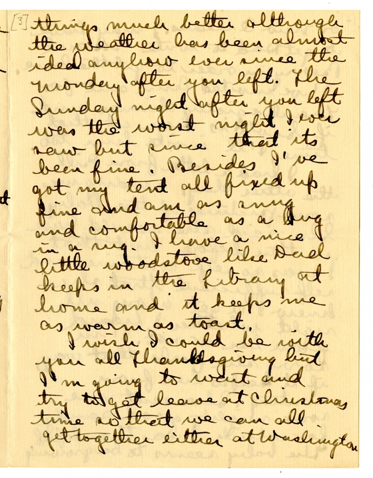 [page 3] things much better although the weather has been almost ideal anyhow ever since the Monday after you left. The Sunday night after you left was the worst night I ever saw but since that its been fine. Besides I’ve got my tent all fixed up fine and am as snug and comfortable as a bug in a rug. I have a nice little woodstove like Dad keeps in the Library at home and it keeps me as warm as toast. I wish I could be with you all Thanksgiving but I’m going to want and try to get leave at Christmas time so that we can all get together either at [Washington, D.C.]
