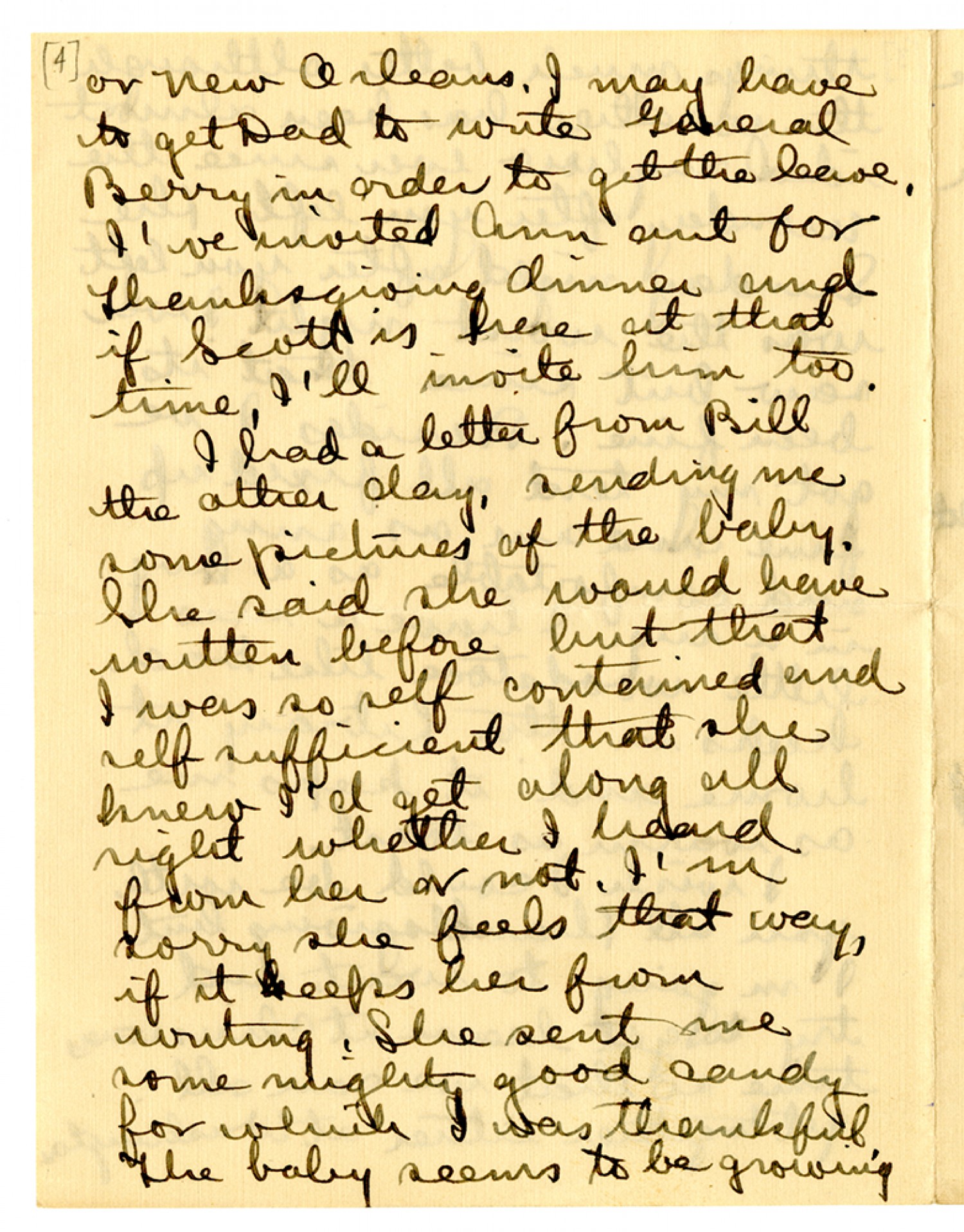 [page 4] or New Orleans. I may have to get Dad to write General Berry in order to get the leave. I’ve invited Ann out for Thanksgiving dinner and if Scott is here at that time, I’ll invite him too. I had a letter from Bill the other day, sending me some pictures of the baby. She said she would have written before but that I was so self contained and self sufficient that she knew I’d get along all right whether I heard from her or not. I’m sorry she feels that way, if it keeps her from writing. She sent me some mighty good candy for which I was thankful. The baby seems to be growing